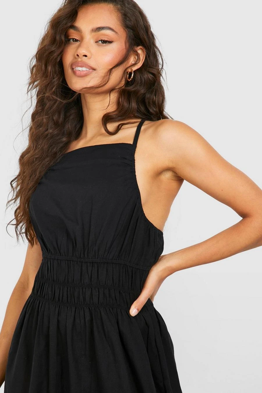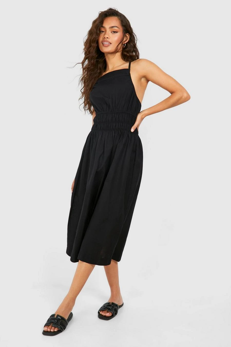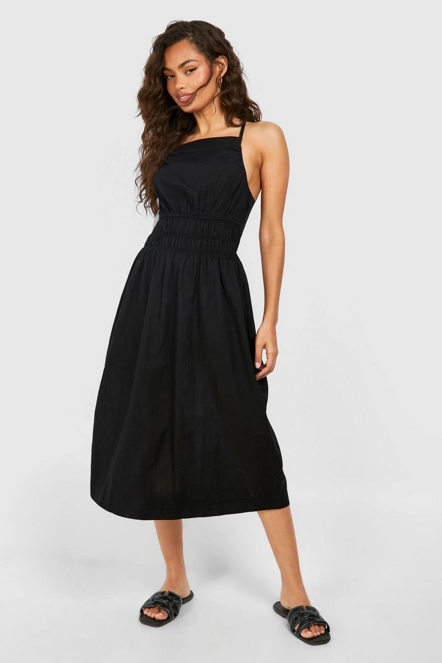 BOOHOO Strappy Linen Look Shirred Waist Midi Dress