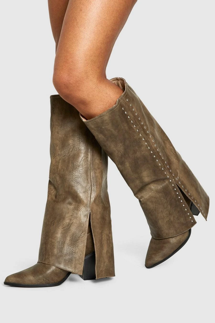 BOOHOO Studded Detail Fold Over Distressed Western Boot