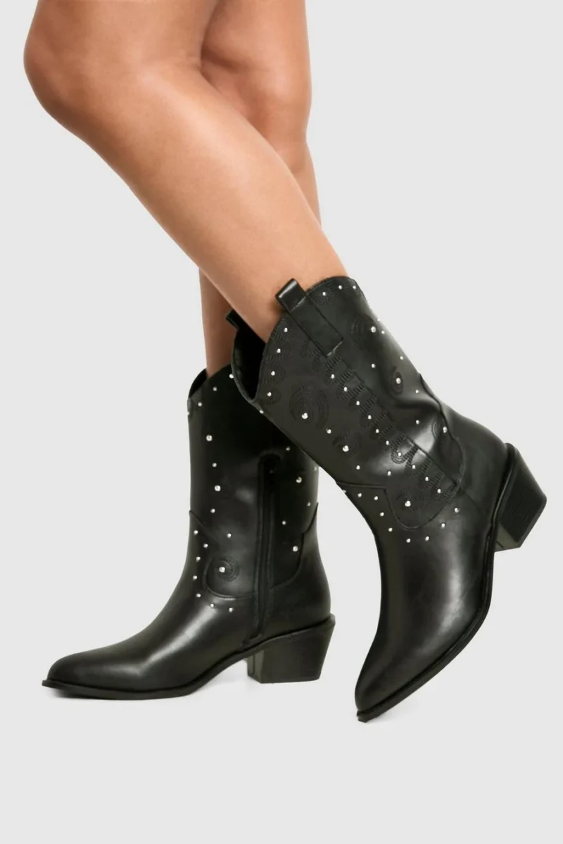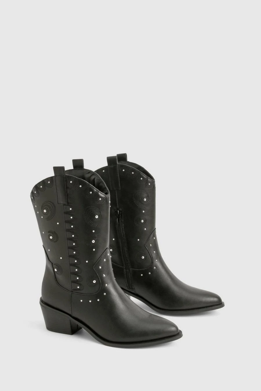 BOOHOO Studded Embossed Detail Heeled Western Boots