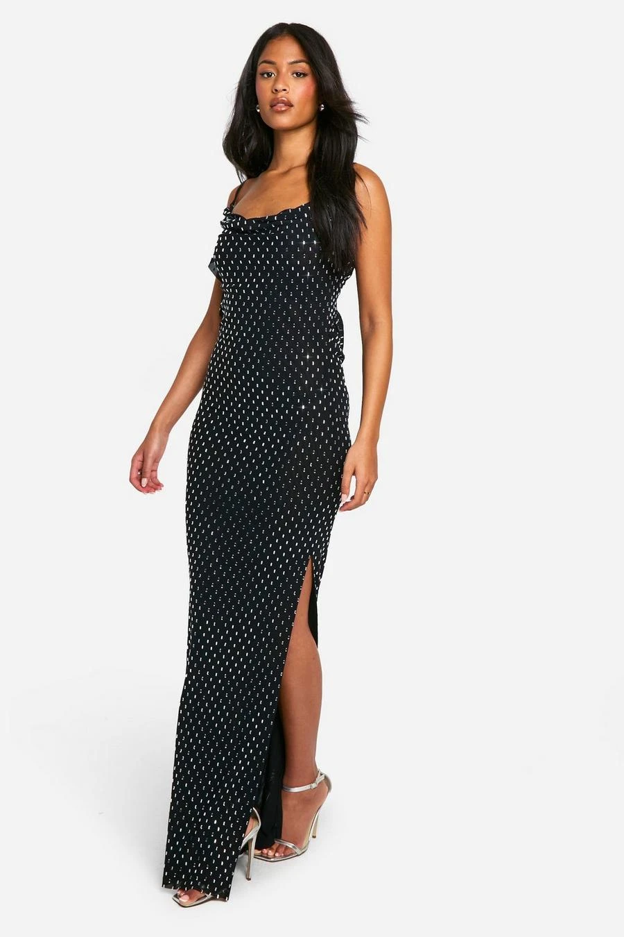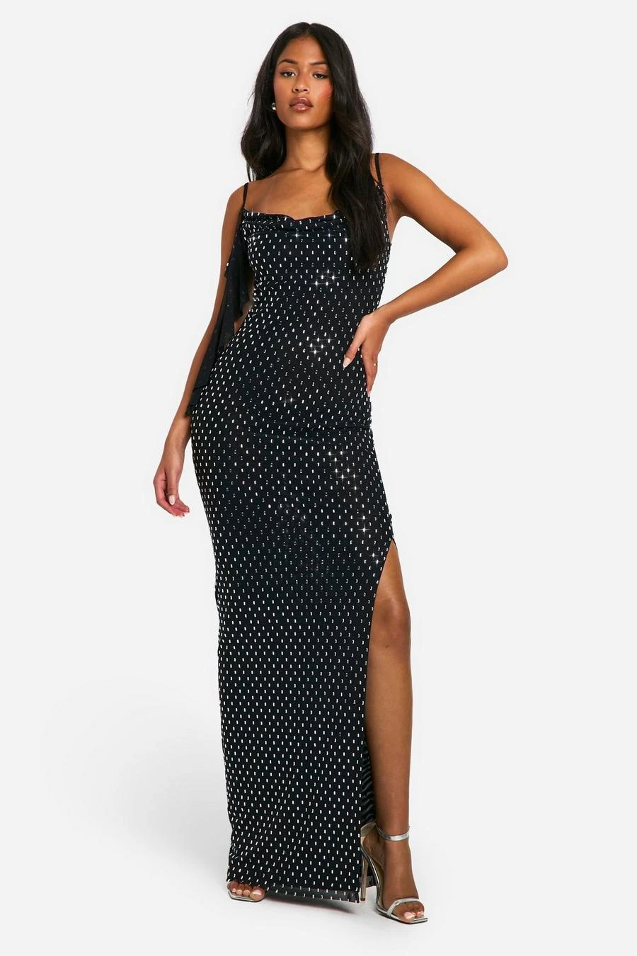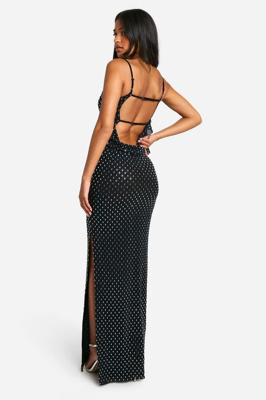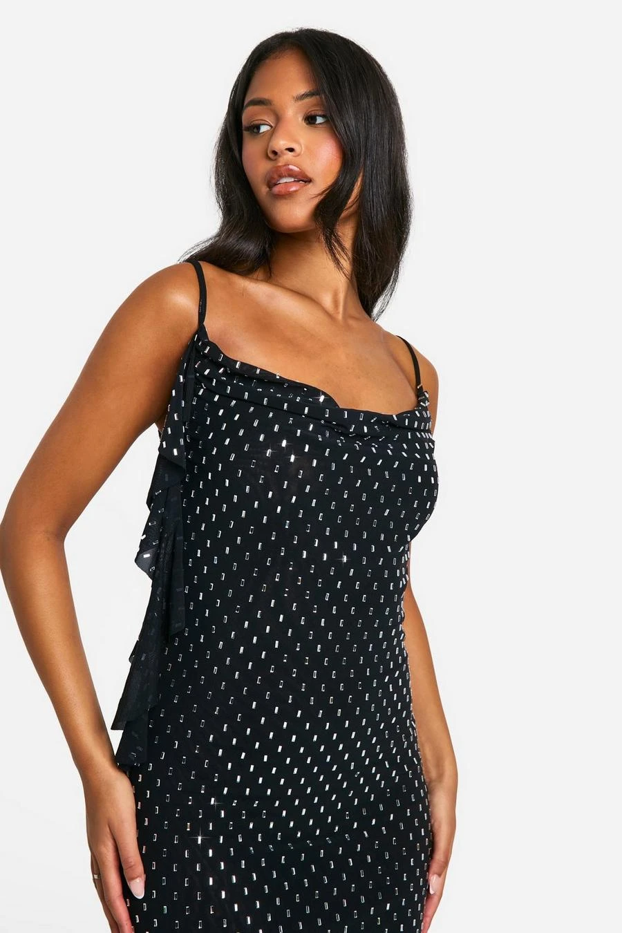 BOOHOO Tall Hotfix Diamante Cowl Neck Frill Maxi Dress