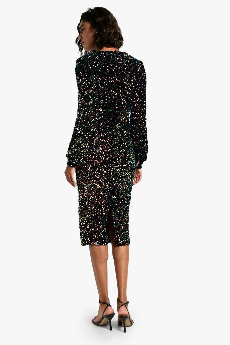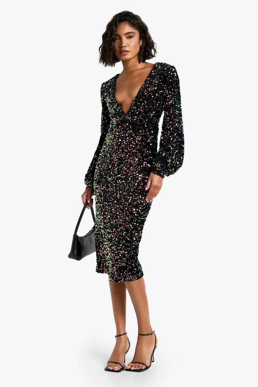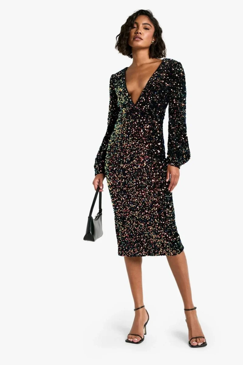 BOOHOO Tall Sequin Balloon Sleeve Plunge Midi Dress
