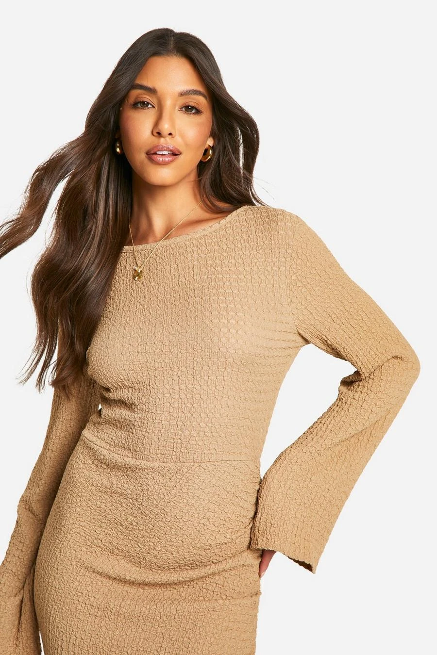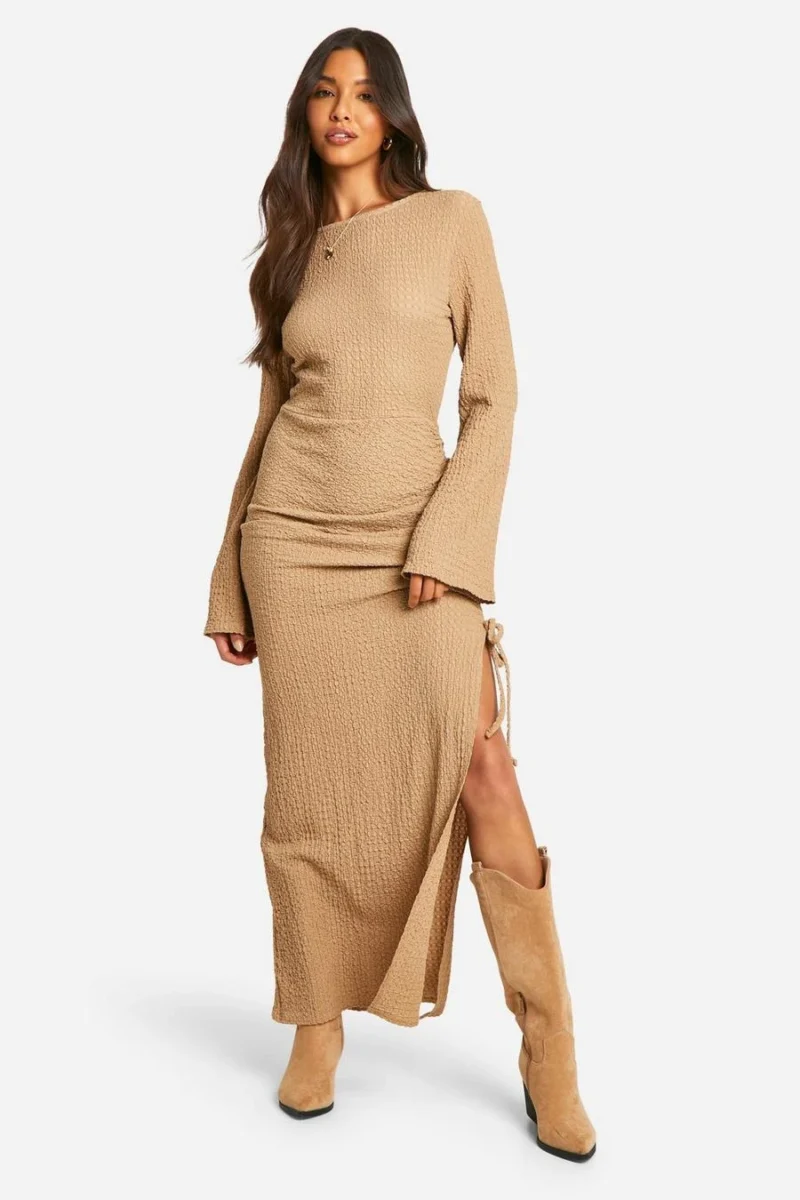BOOHOO Textured Ruched Flare Sleeve Maxi Dress