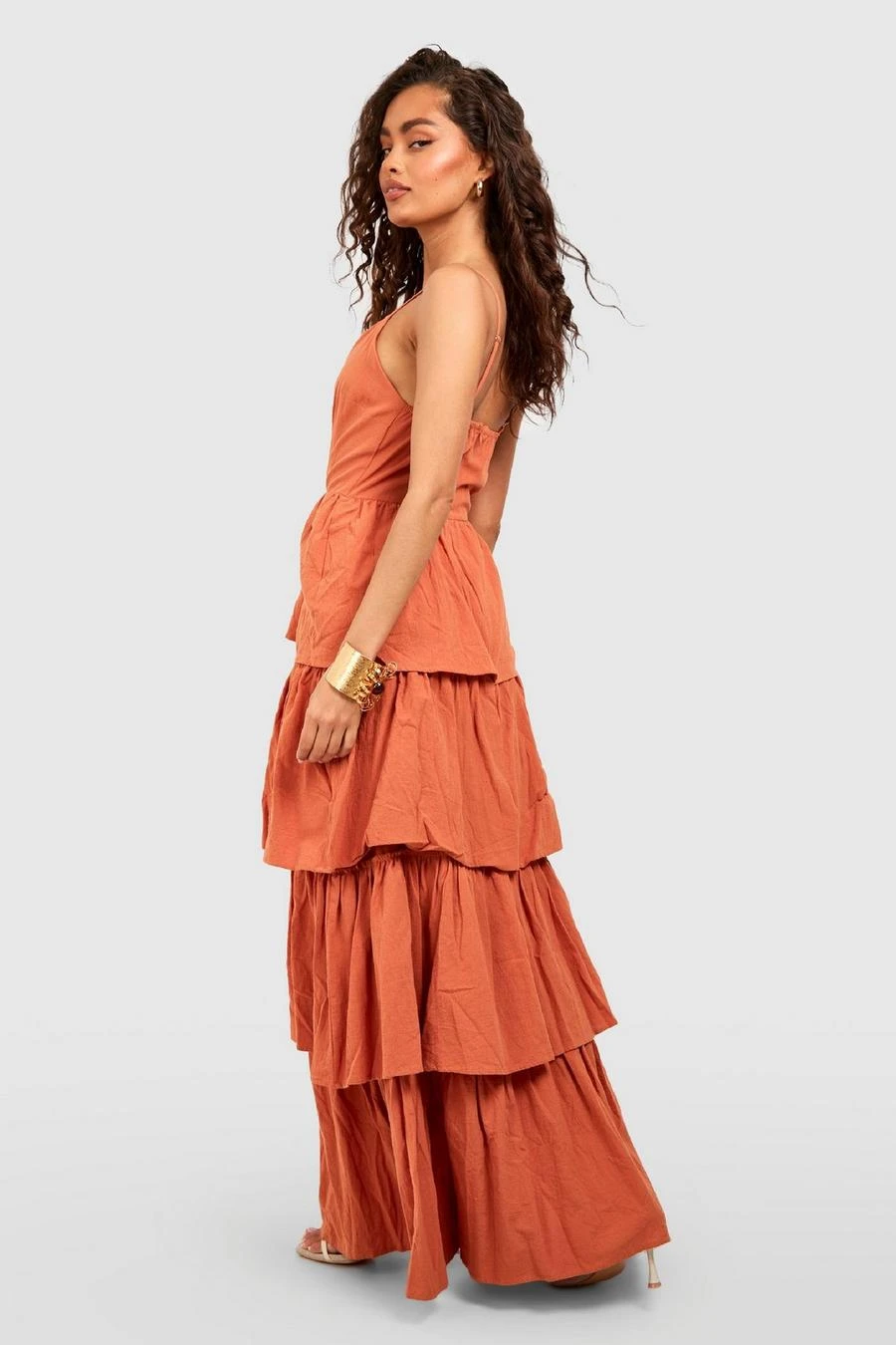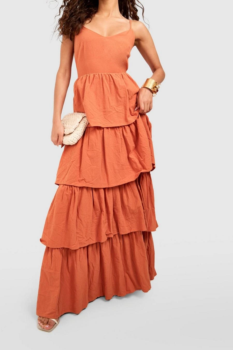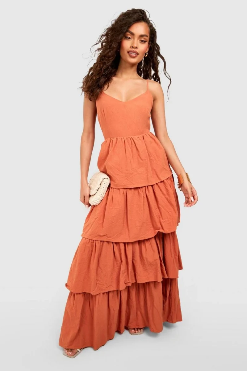 BOOHOO V Neck Tiered Linen Look Maxi Dress