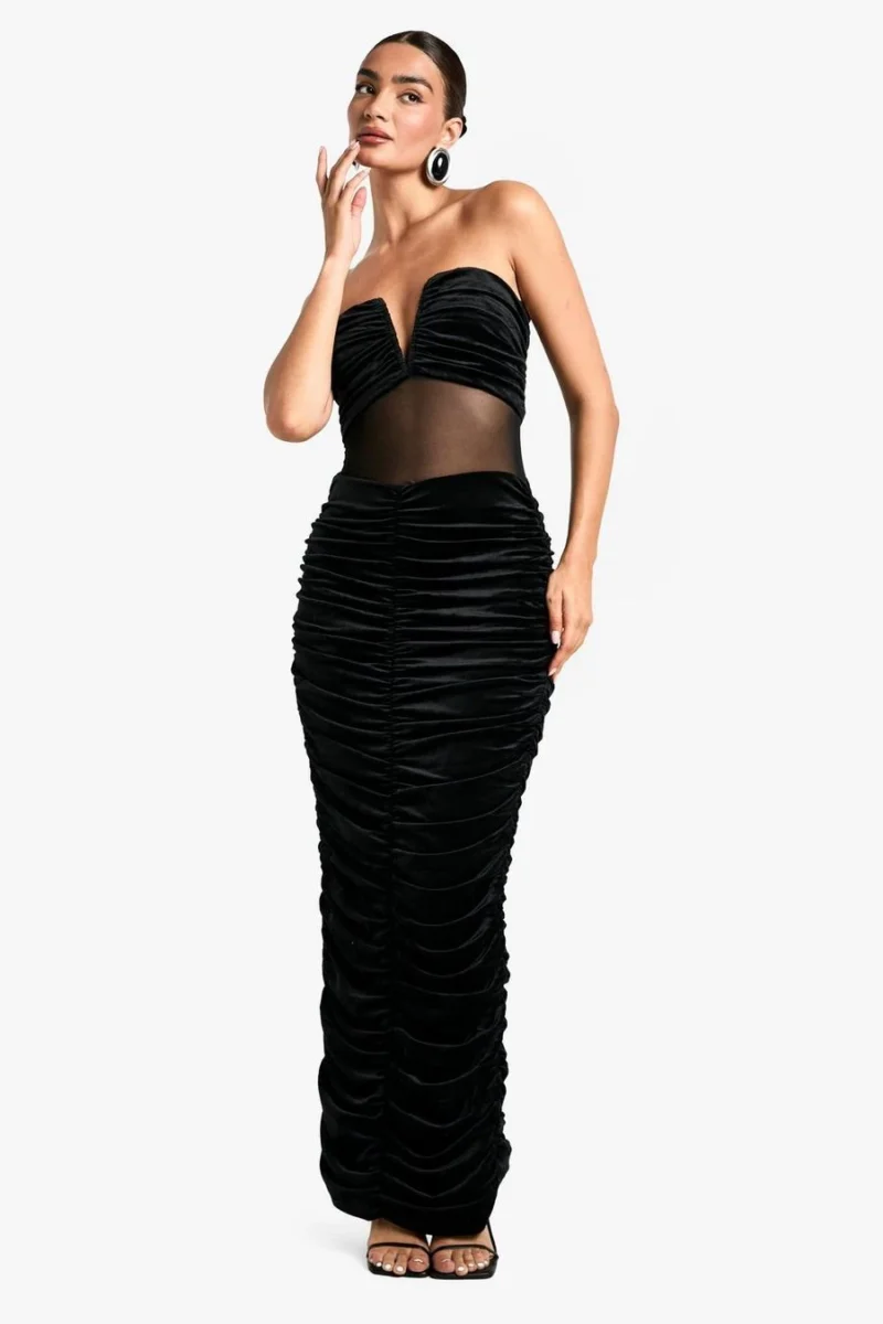 BOOHOO Velvet Mesh Plunge Ruched Maxi Dress