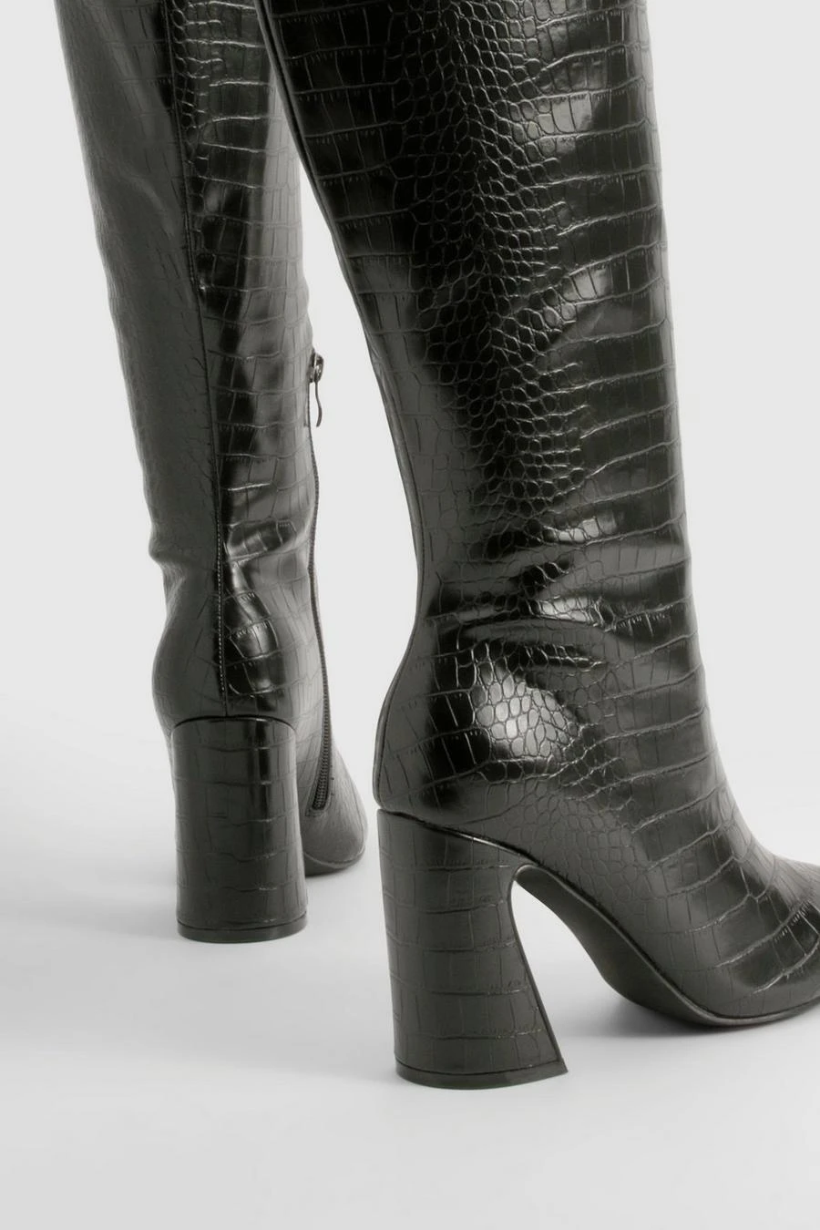 BOOHOO Wide Fit Croc Flared Heel Knee High Boots
