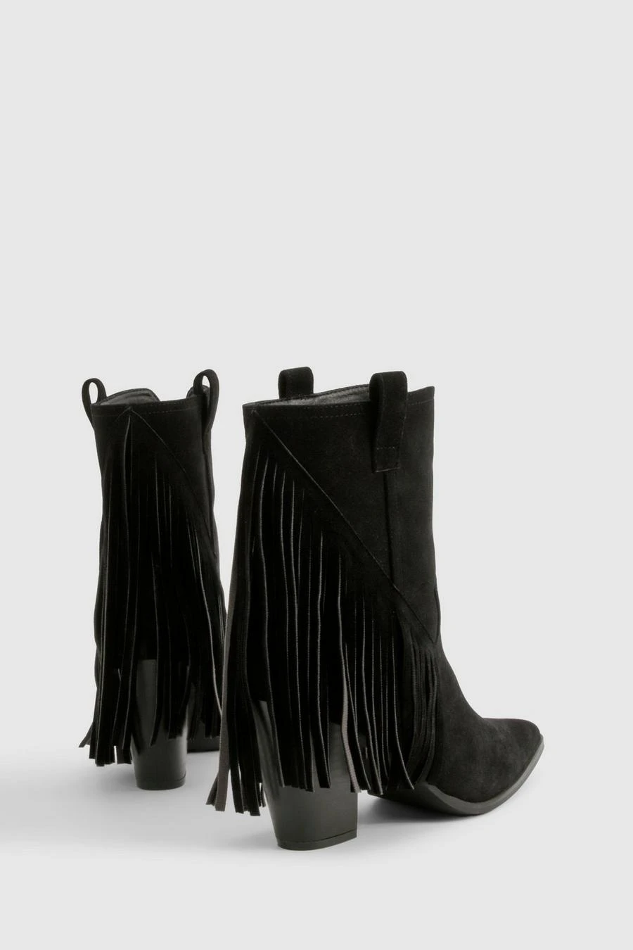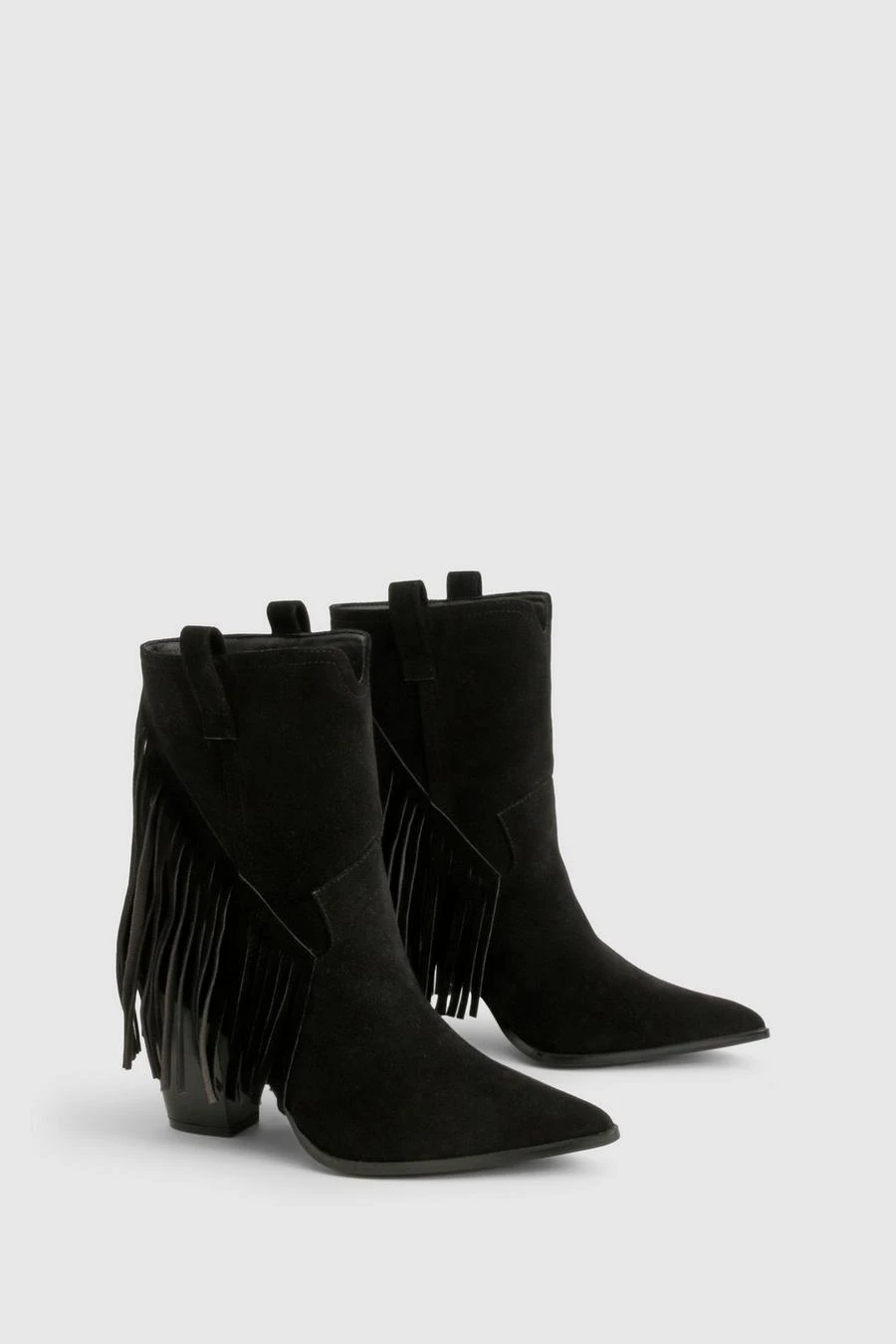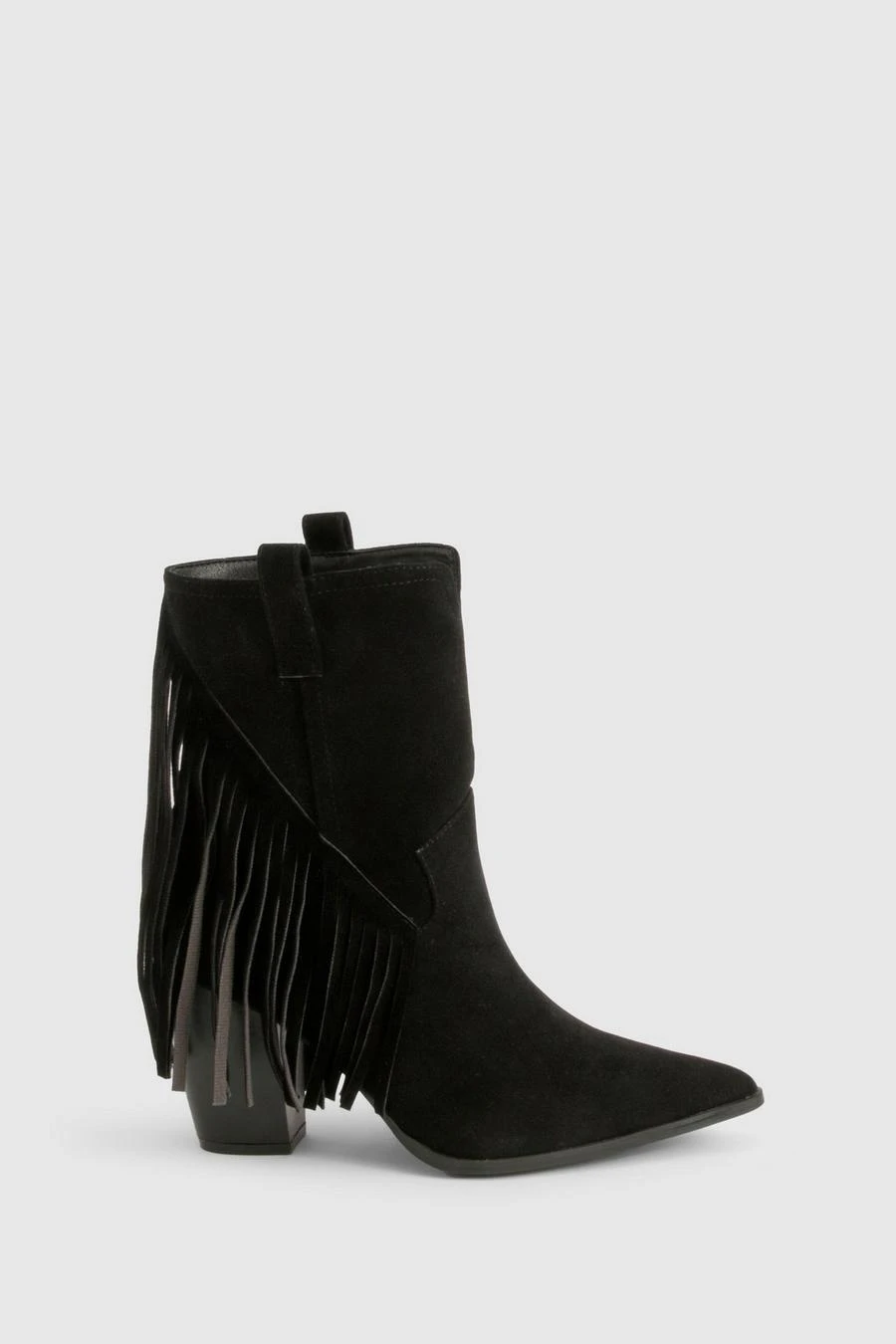 BOOHOO Wide Fit Faux Suede Fringe Tassel Detail Heeled Western Ankle Boot
