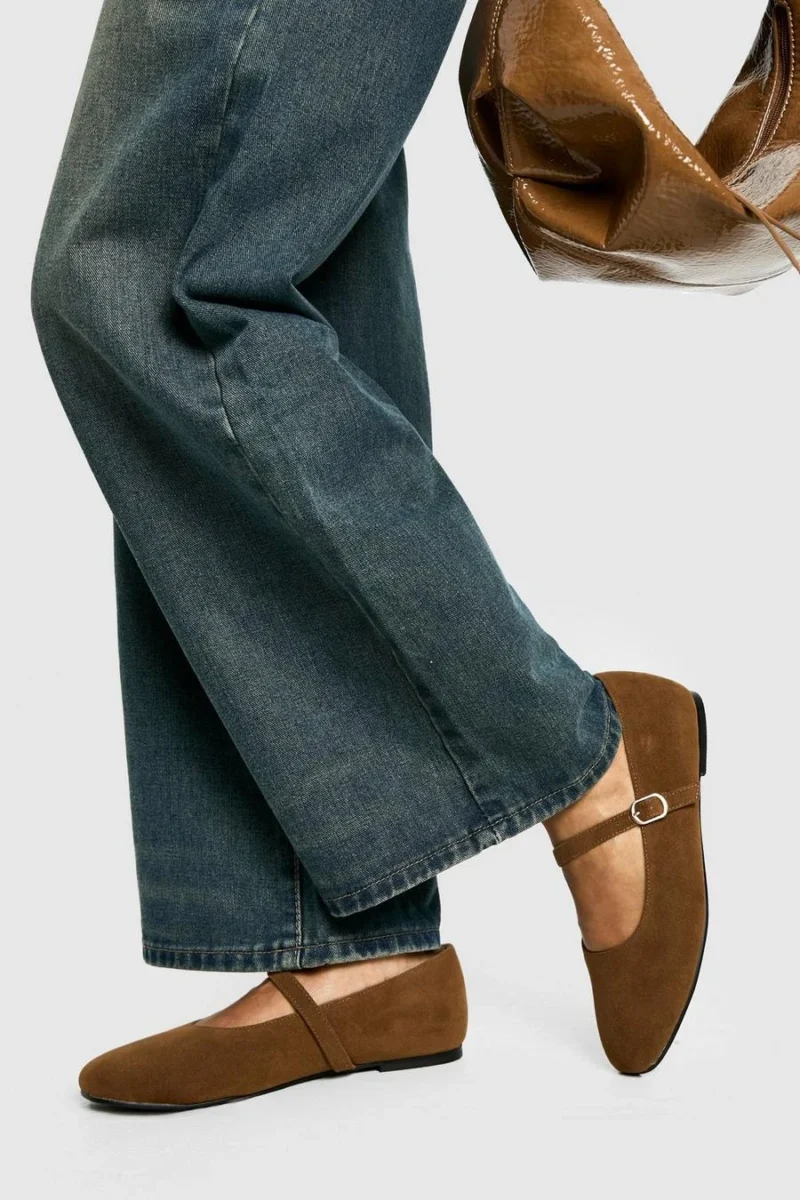 BOOHOO Wide Fit Faux Suede Mary Jane Ballet Flats