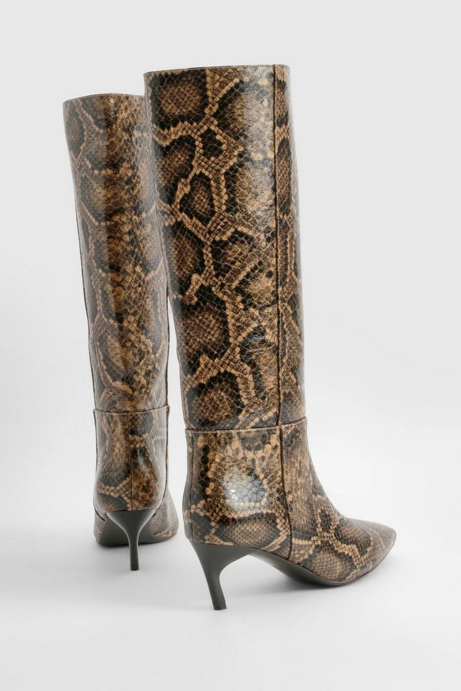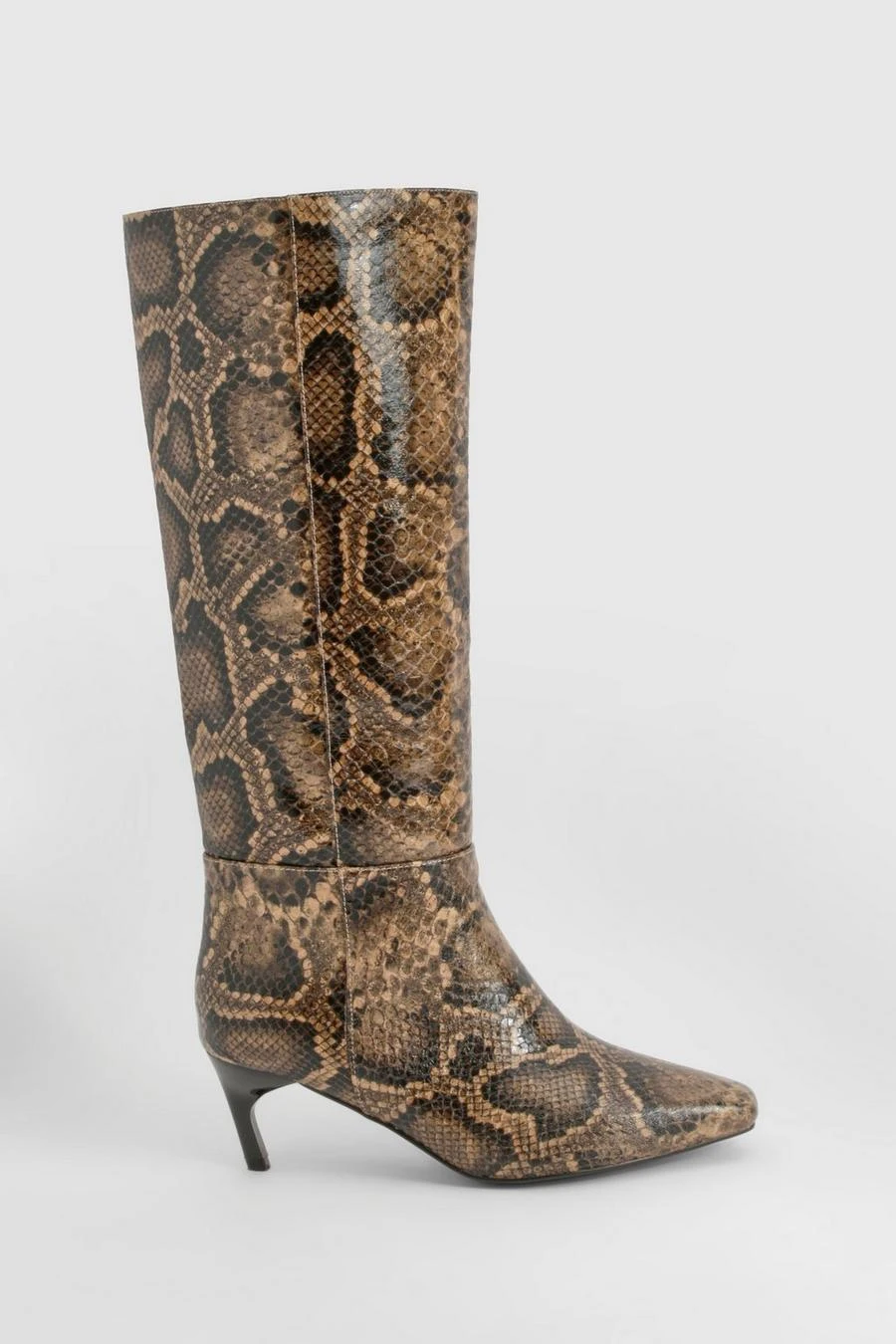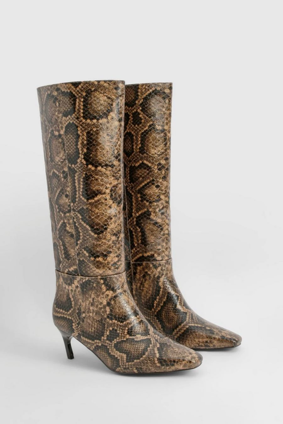 BOOHOO Wide Fit Snake Print Low Square Toe Knee High Boots