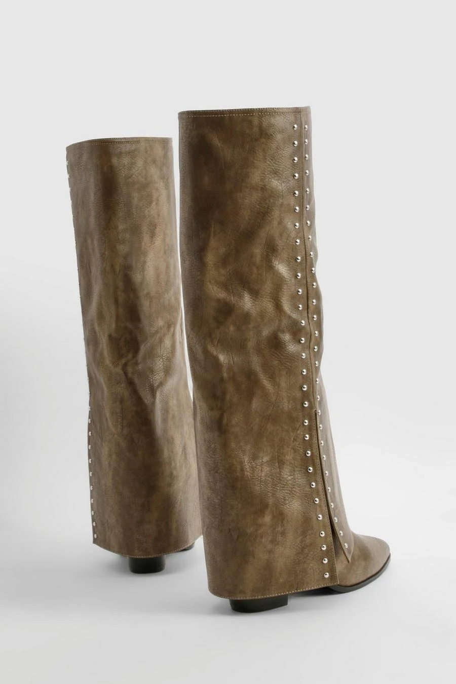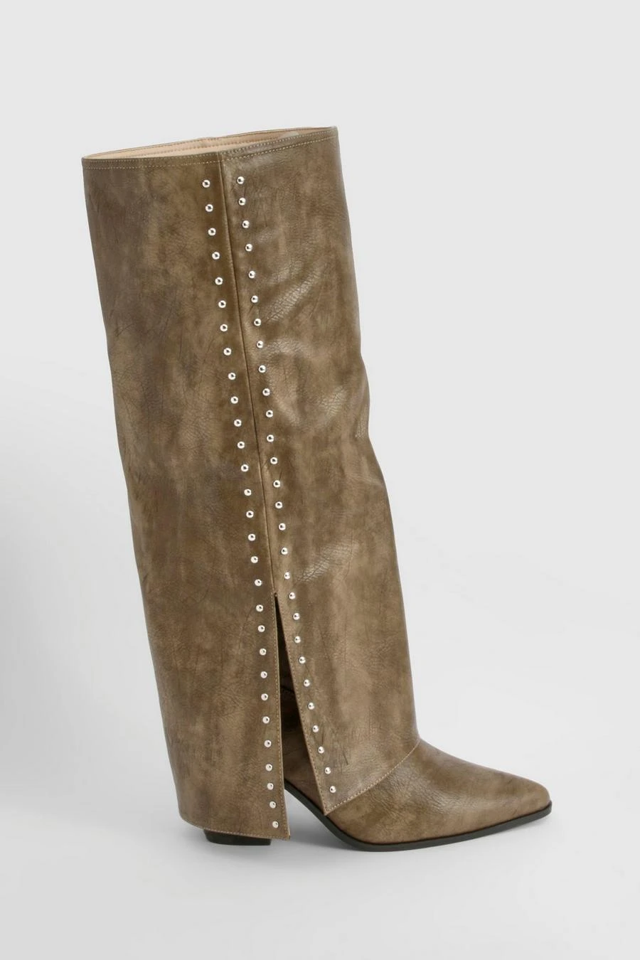 BOOHOO Wide Fit Studded Detail Fold Over Distressed Western Boot