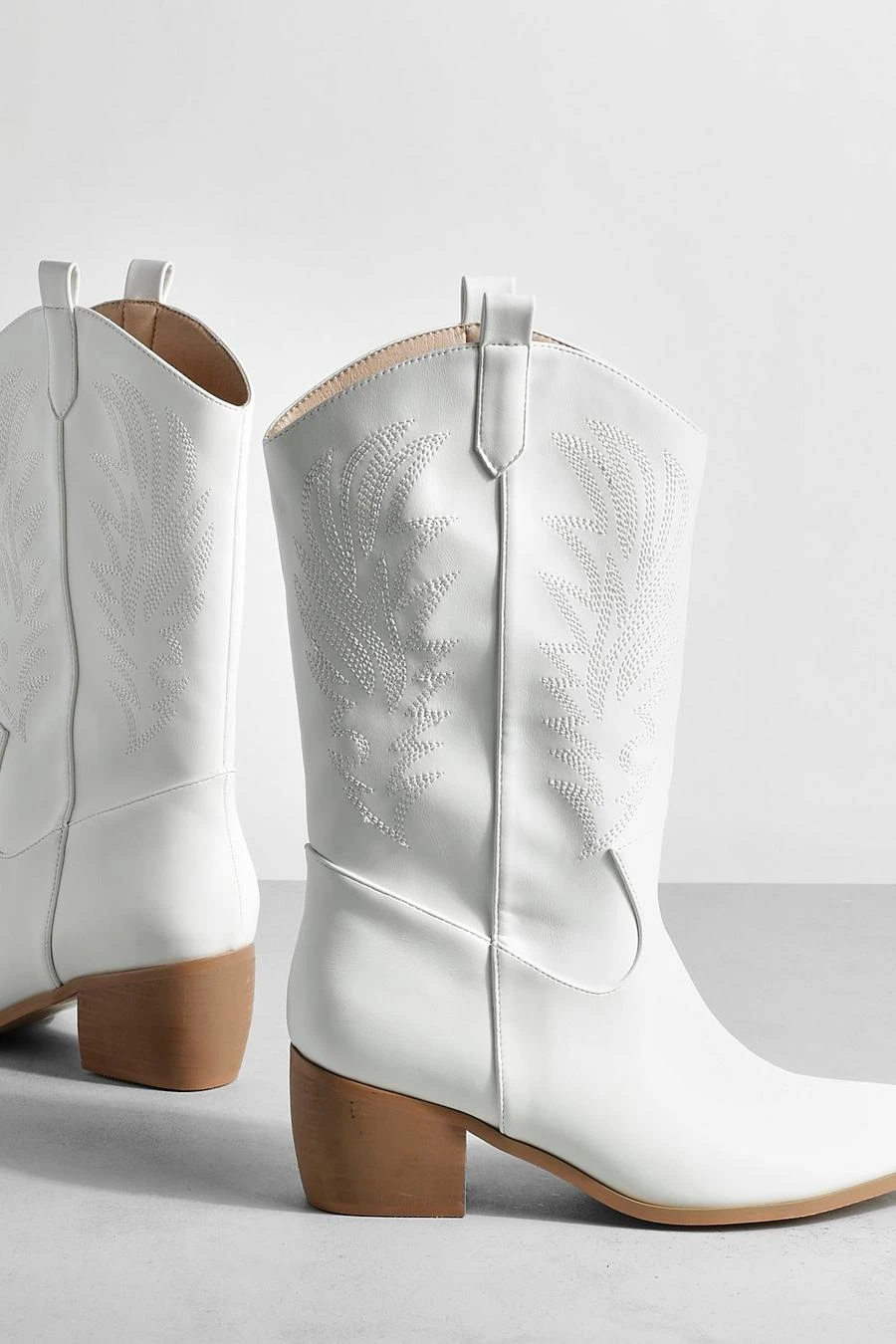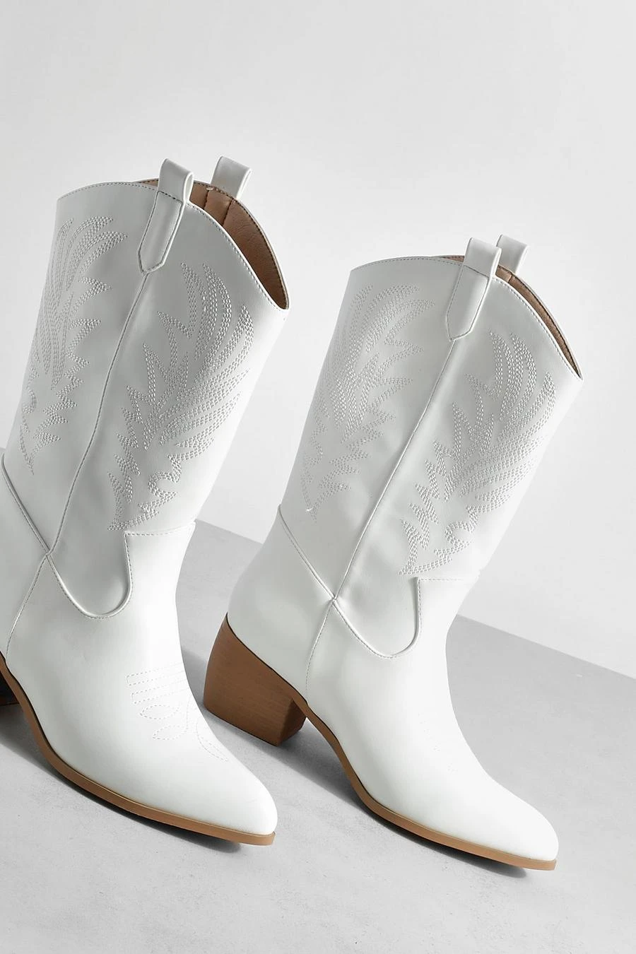 Yee-haw, these wide fit cowboy western boots would look so good on you! Trending this season, these western-inspired ankle length boots will level up any outfit. They’re made from a super soft faux leather and are adorned in all-over stitch detail for that timeless cowboy look. Curved tops and tab detail make them a true icon.