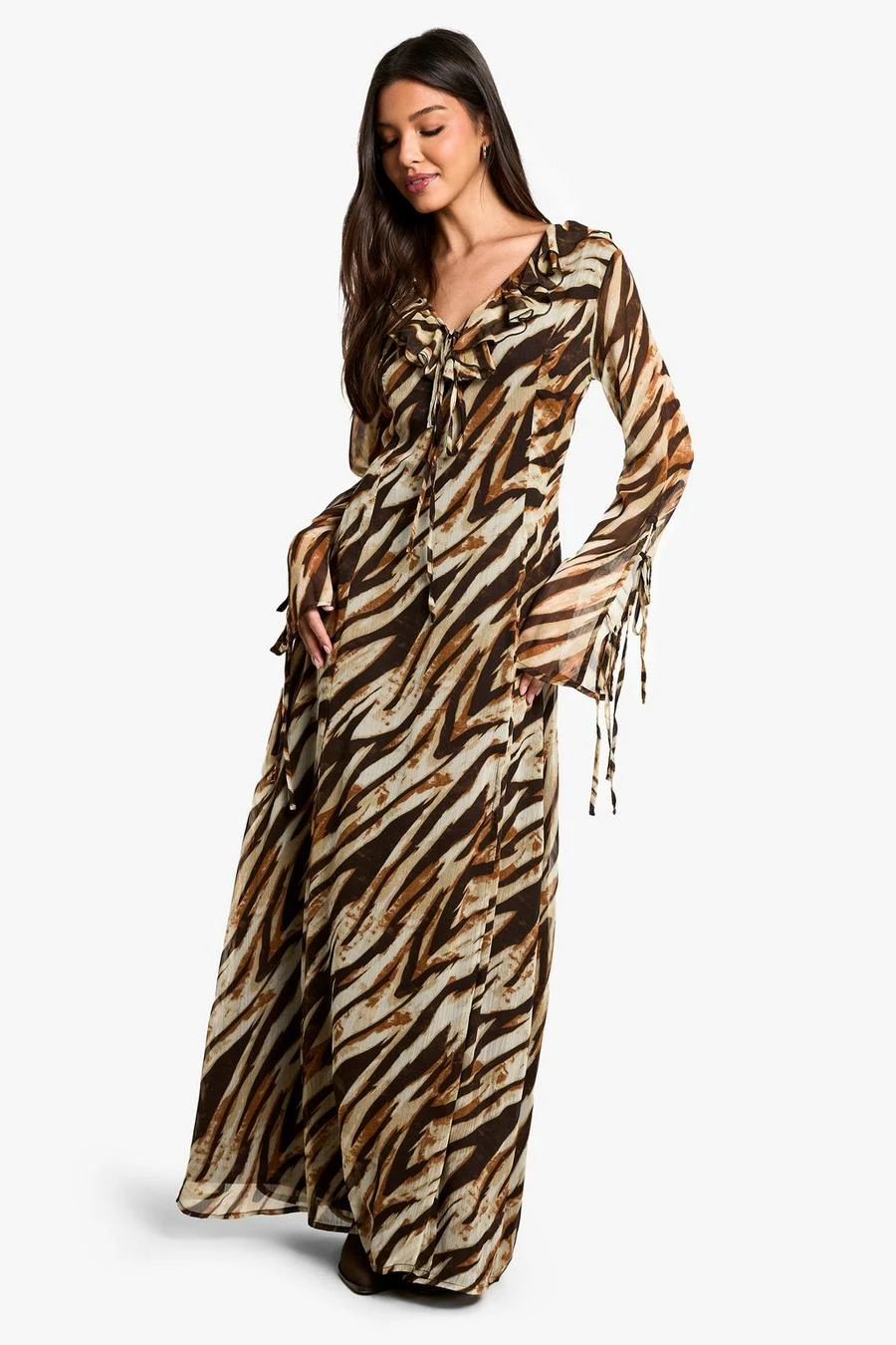 BOOHOO Zebra Ruffle Tie Sleeve Belted Chiffon Maxi Dress