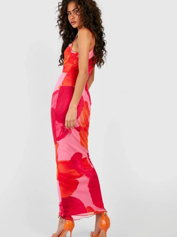 BOOHOO Abstract Floral Print Mesh Maxi Slip Dress