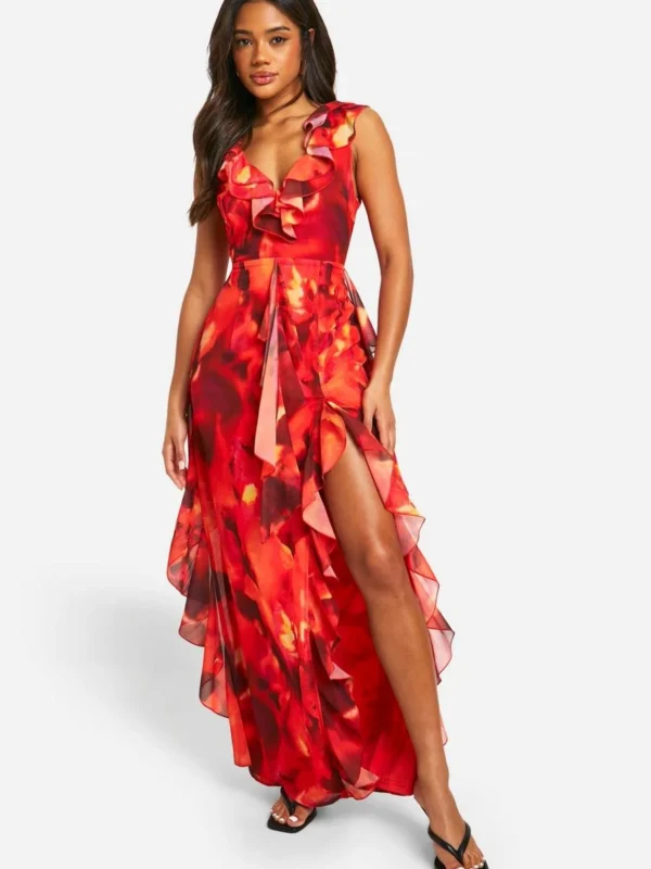 BOOHOO Abstract Floral Ruffle Maxi Dress