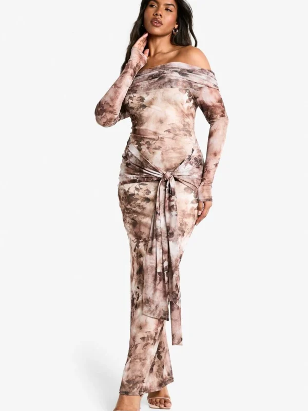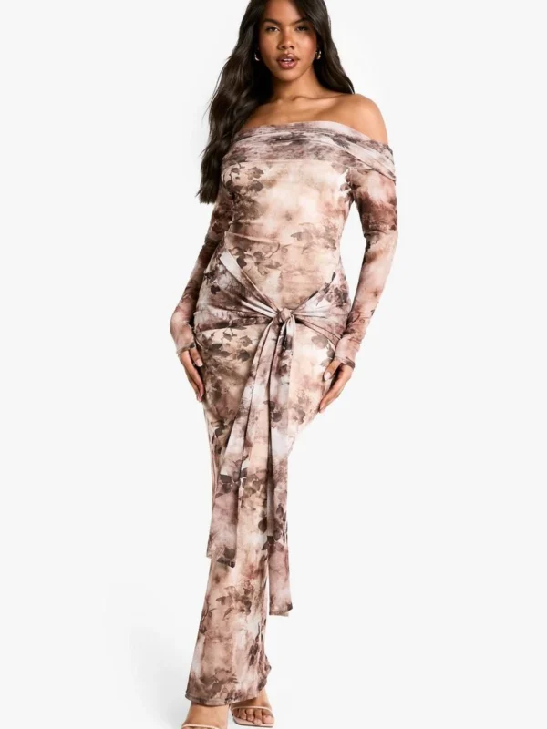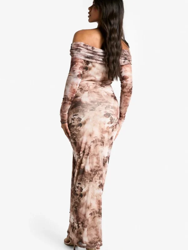 BOOHOO Abstract Bardot Mesh Long Sleeve Maxi Dress
