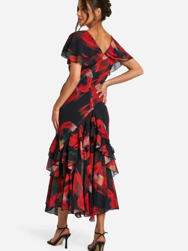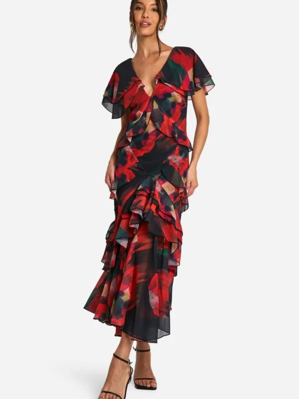 BOOHOO Blur Print Chiffon Ruffle Midi Dress