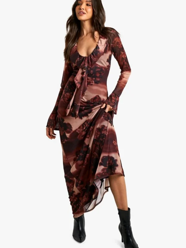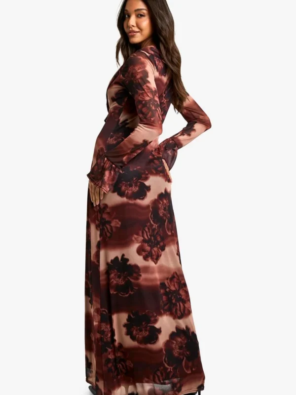 BOOHOO Blurred Floral Mesh Ruffle Maxi Dress