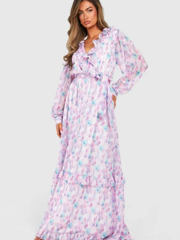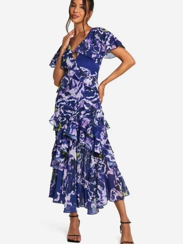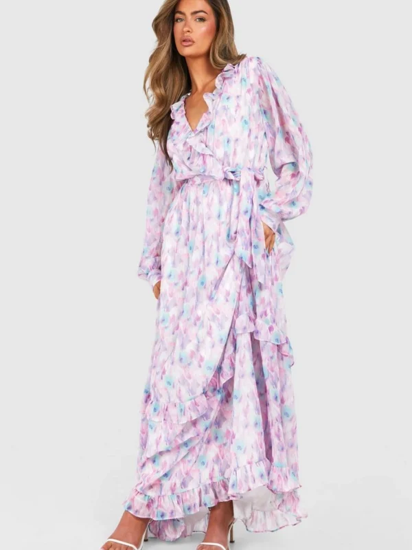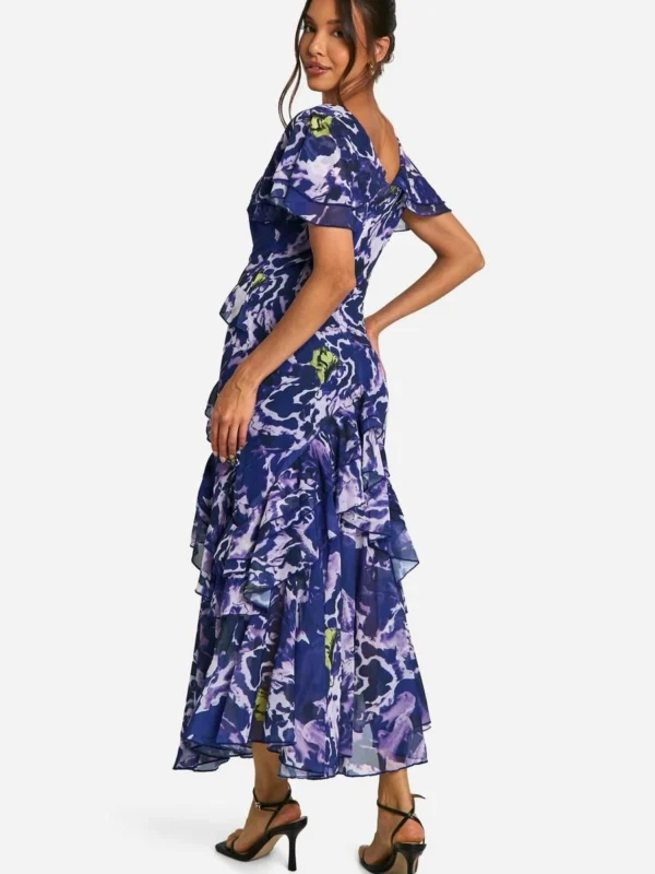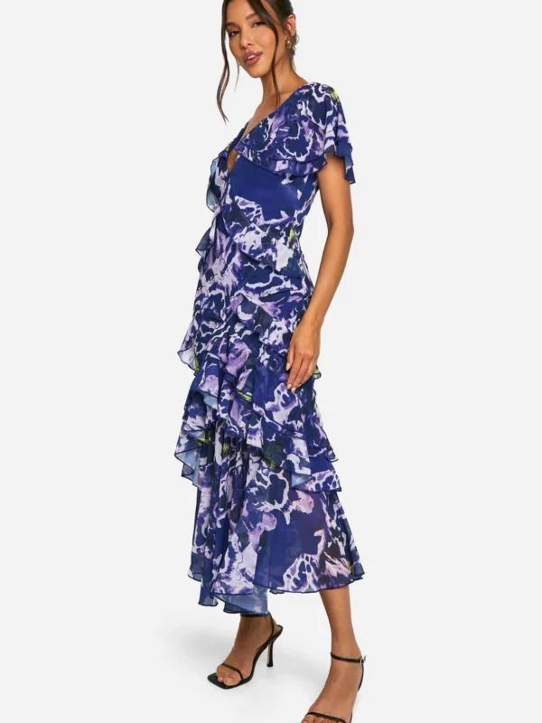 BOOHOO Blurred Floral Print Ruffle Detail Maxi Dress