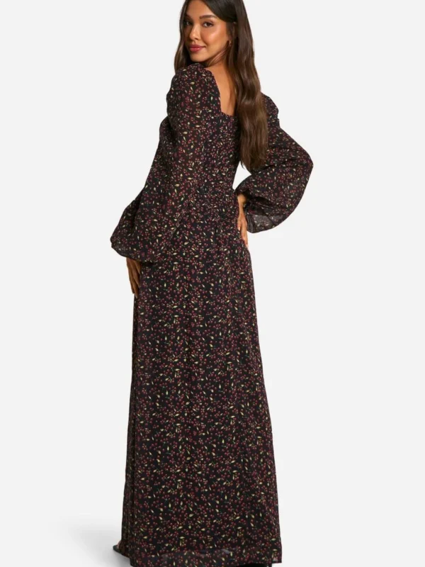BOOHOO Chiffon Cherry Print Puff Sleeve Milkmaid Maxi Dress