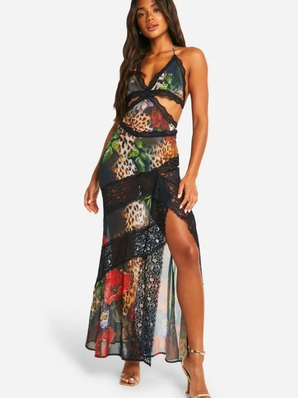BOOHOO Chiffon Lace Cut Out Printed Maxi Dress