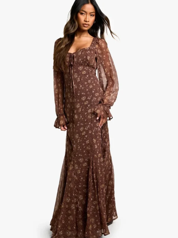 BOOHOO Ditsy Floral Crinkle Chiffon Milkmaid Maxi Dress