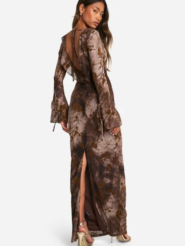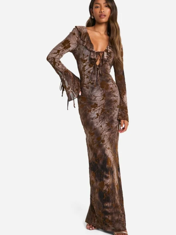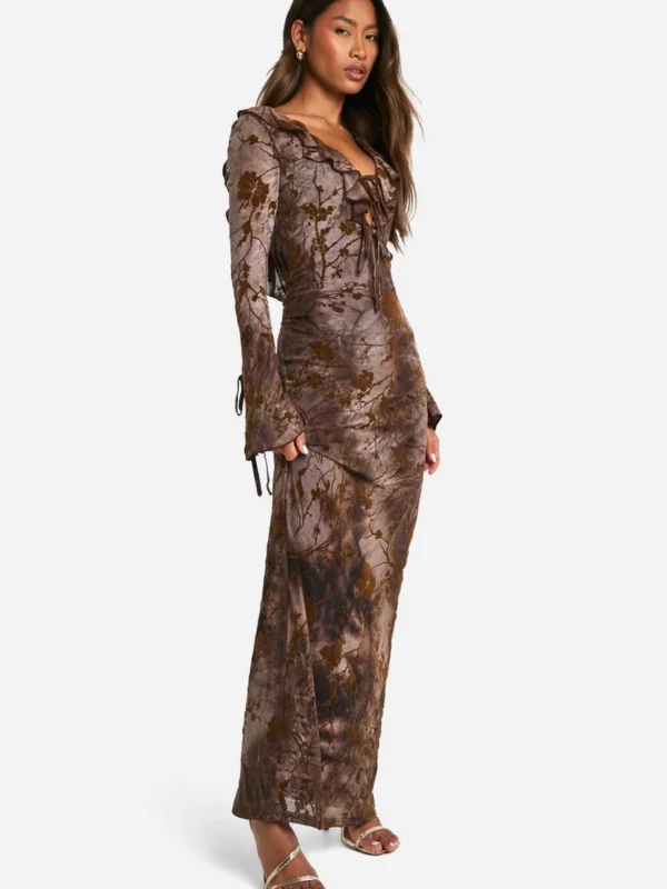 BOOHOO Devore Ruffle Front Tie Sleeve Maxi Dress