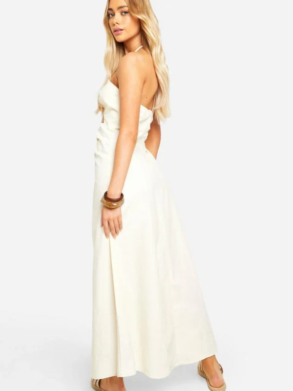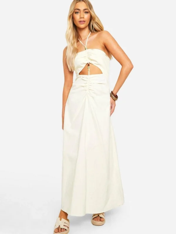 BOOHOO Bead Detail Ruched Linen Look Maxi Dress