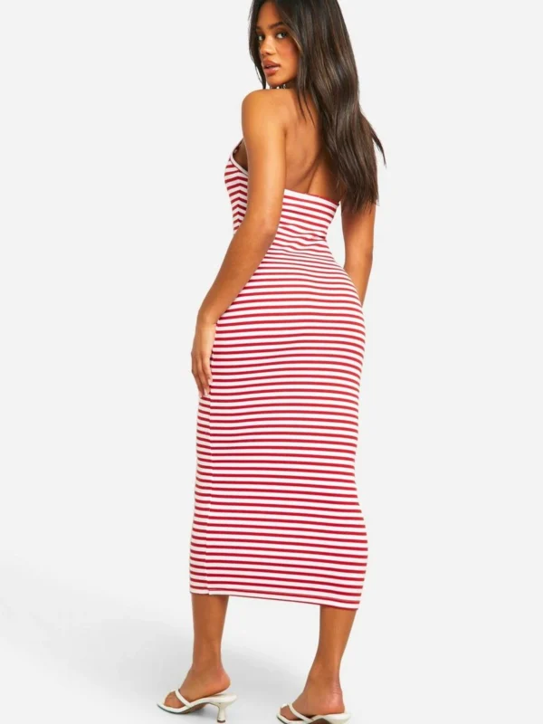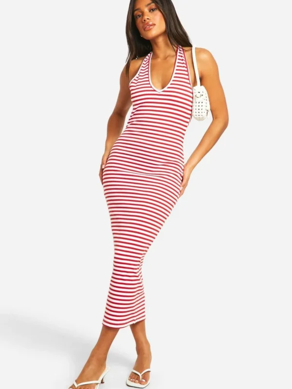 BOOHOO Basic Rib Stripe Plunge Hlater Midaxi Dress