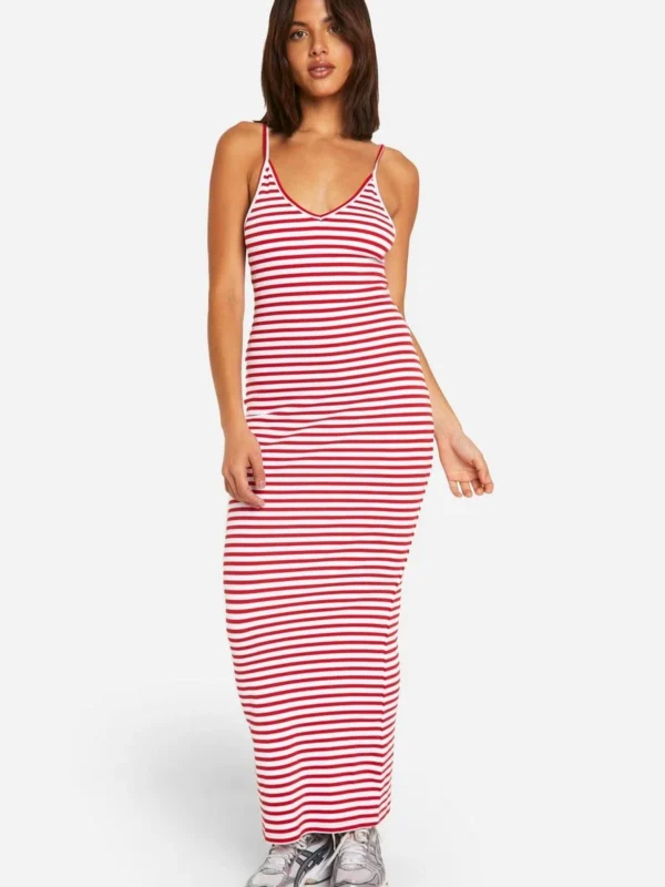 BOOHOO Basic Rib Stripe V Neck Maxi Dress