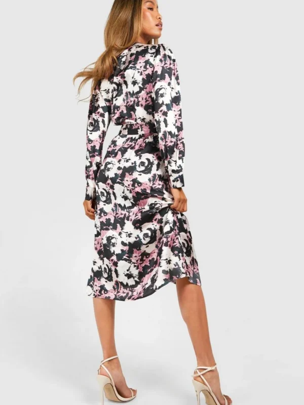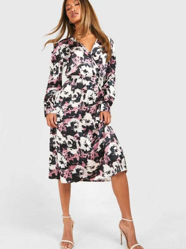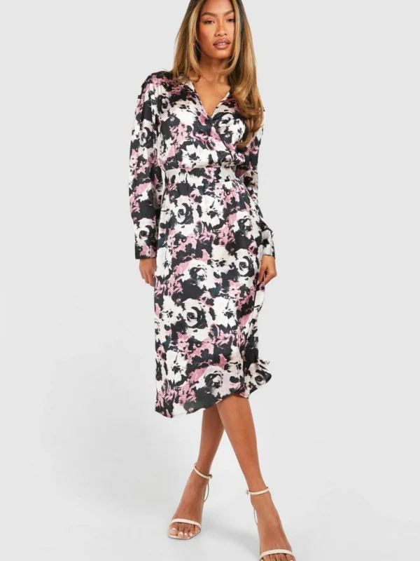 BOOHOO Dark Floral Satin Wrap Midi Dress