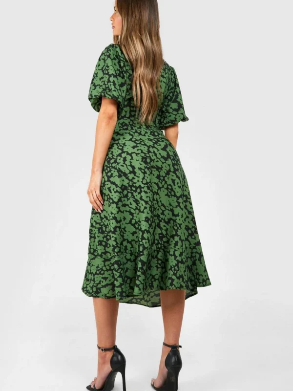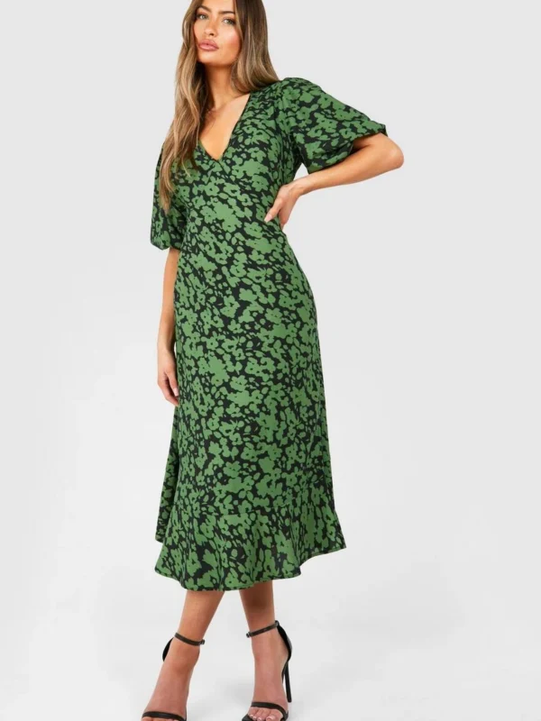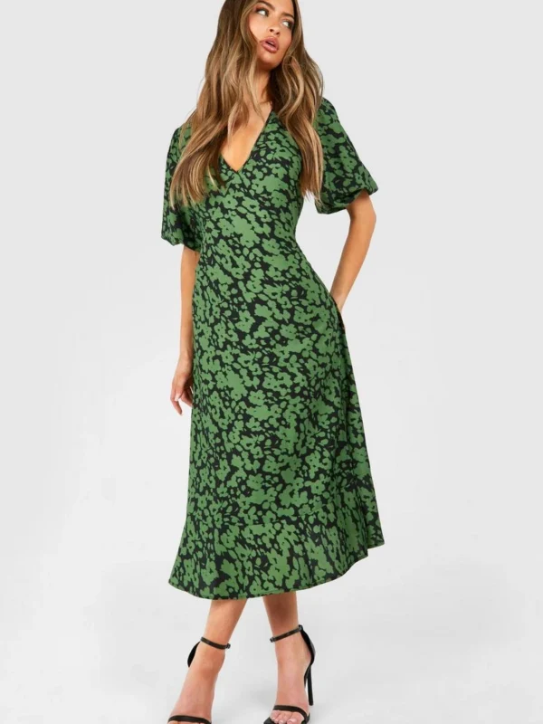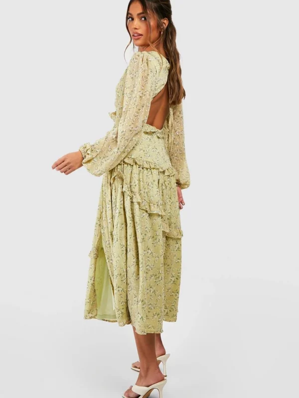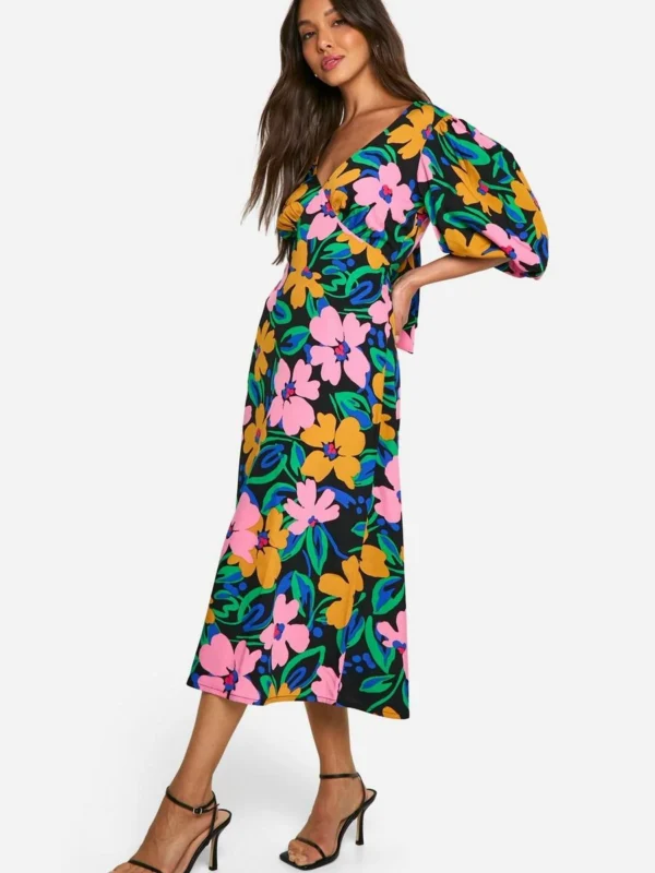 BOOHOO Floral Puff Sleeve Tie Back Midi Dress