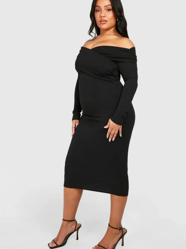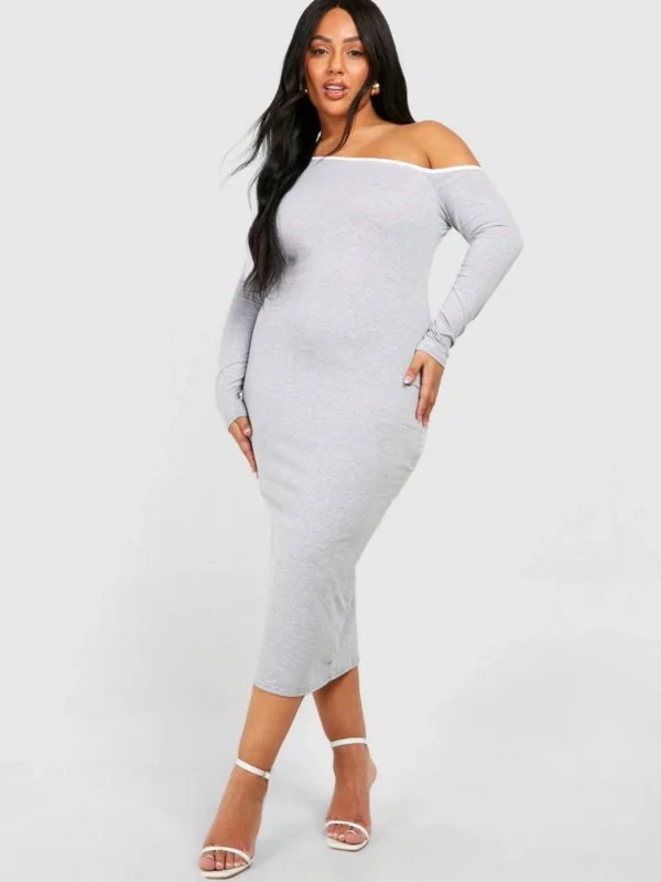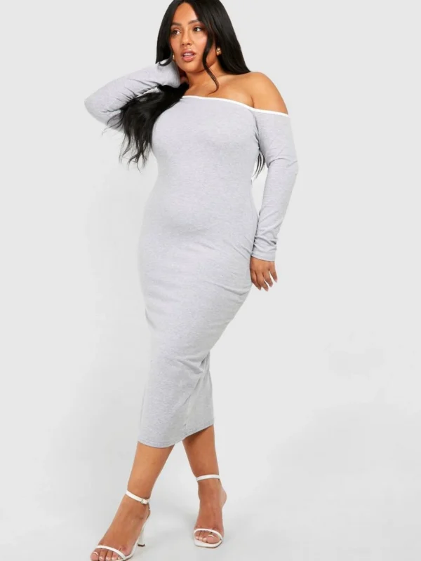BOOHOO Plus Cotton Elastance Contrast Off Shoulder Midi Dress
