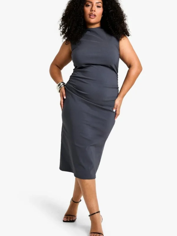 BOOHOO Plus Bengaline Rouched High Neck Midi Dress