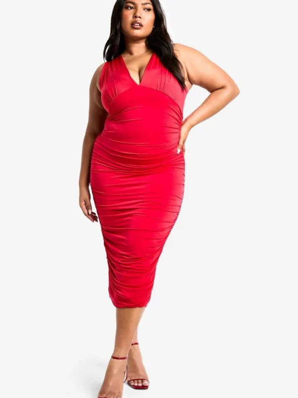 BOOHOO Plus Double Slinky Plunge Ruched Midi Dress