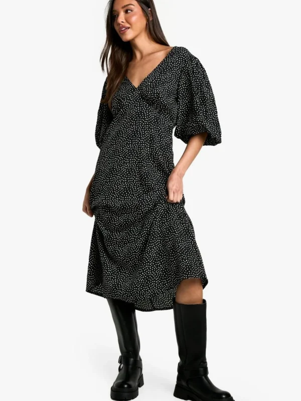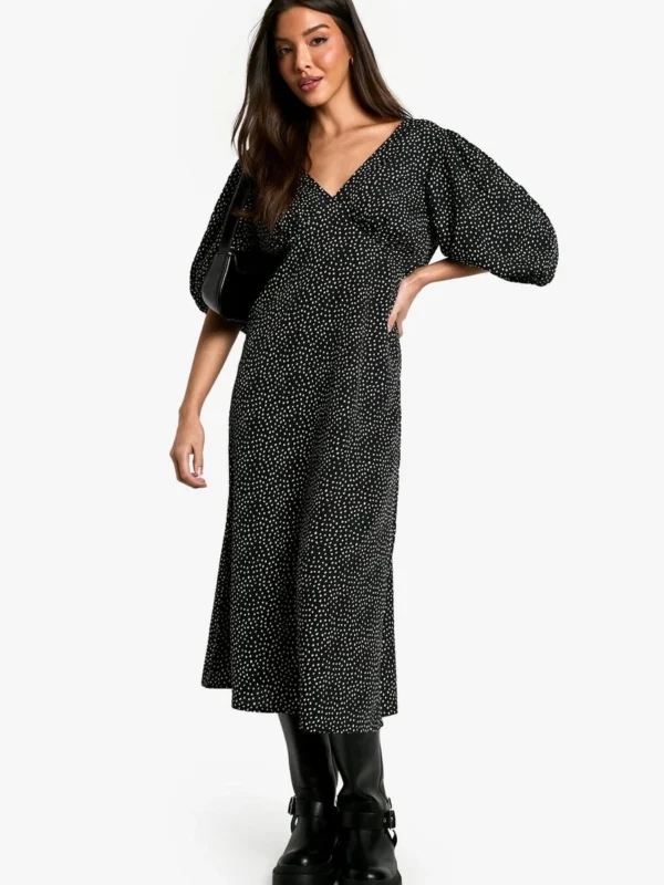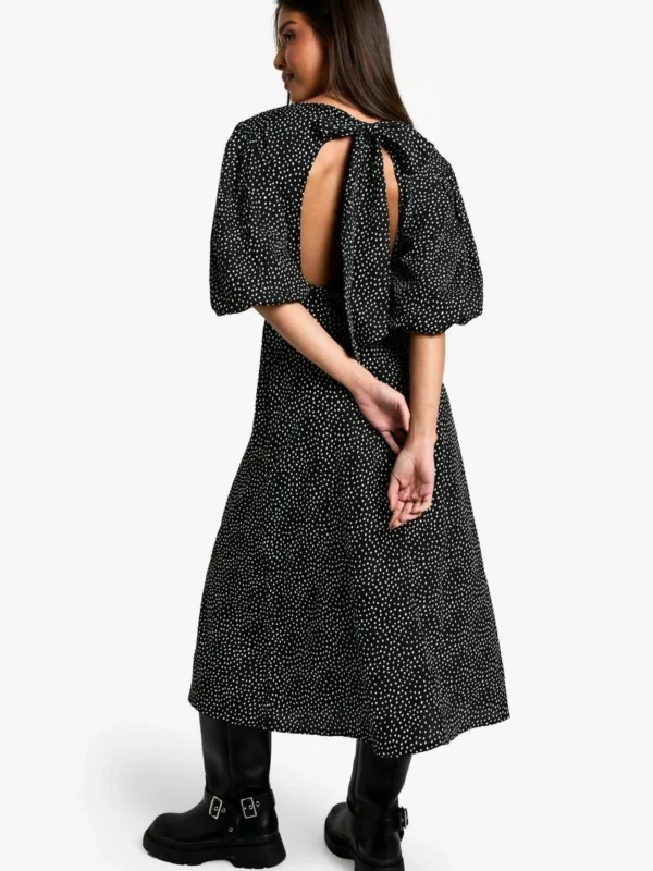 BOOHOO Polka Dot Puff Sleeve Tie Back Midi Dress