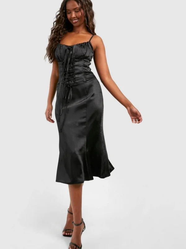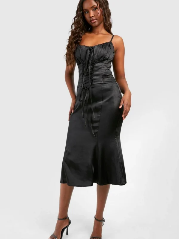 BOOHOO Satin Lace Up Corset Midi Dress