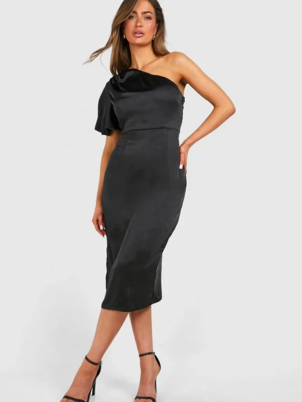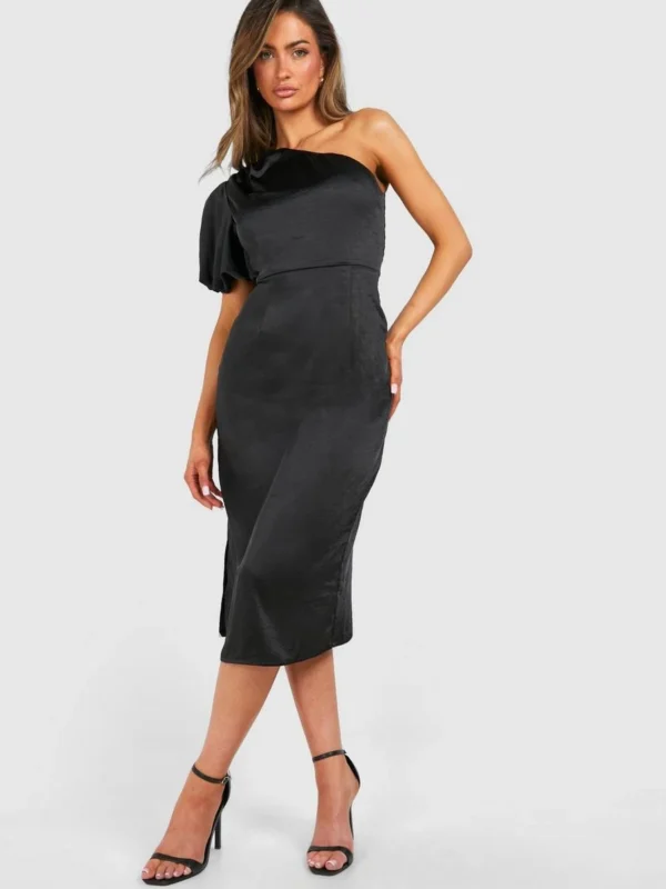 BOOHOO Satin Puff Sleeve Asymmetric Midi Dress