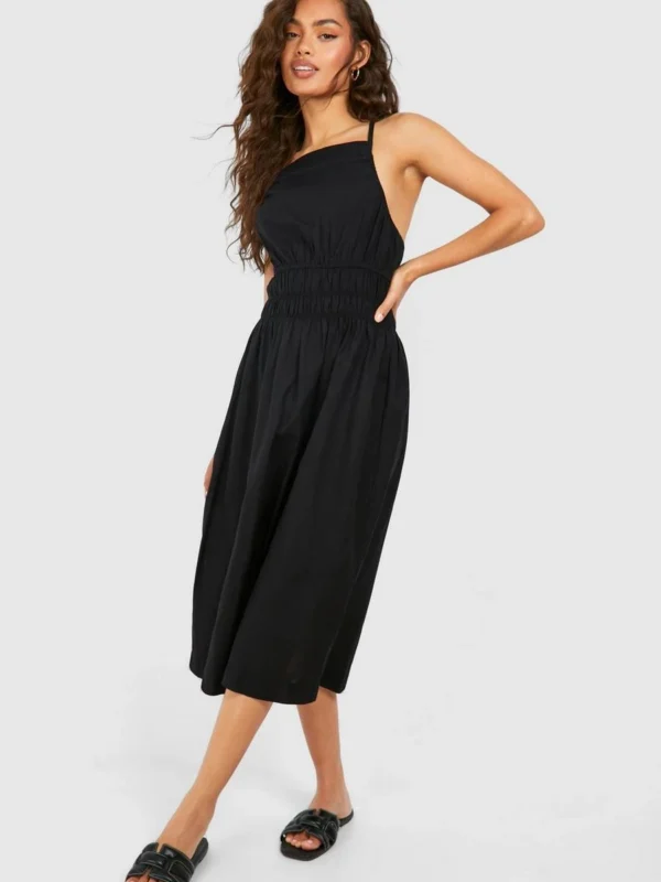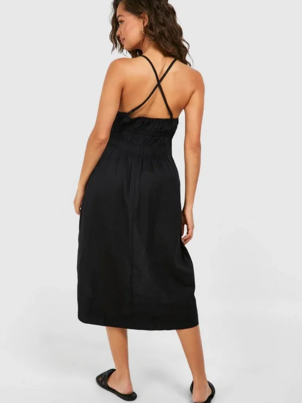 BOOHOO Strappy Linen Look Shirred Waist Midi Dress