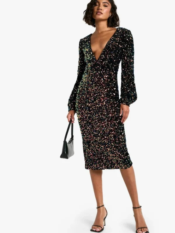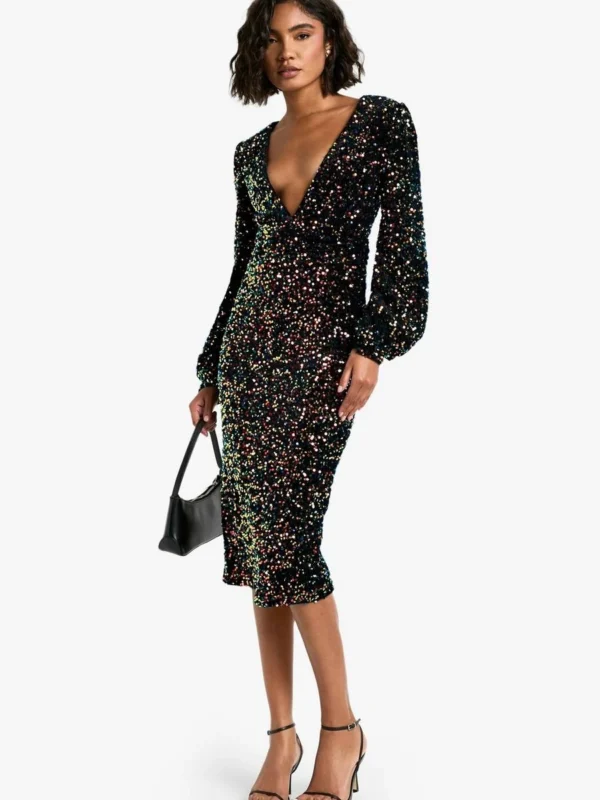 BOOHOO Tall Sequin Balloon Sleeve Plunge Midi Dress