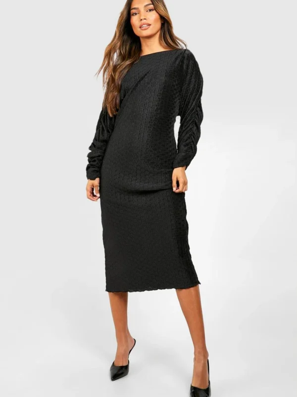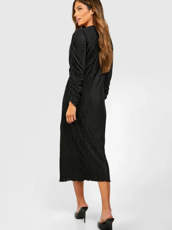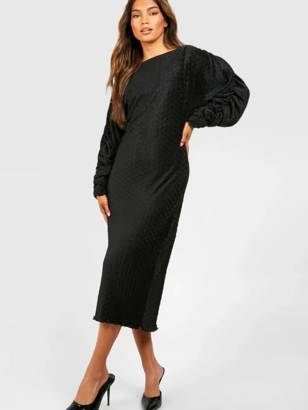 BOOHOO Wave Plisse Rouched Sleeve Midi Dress
