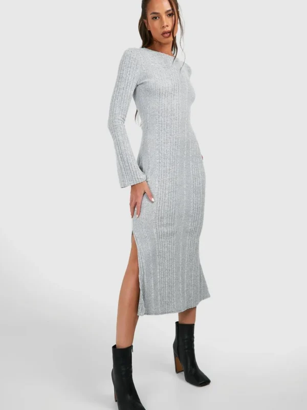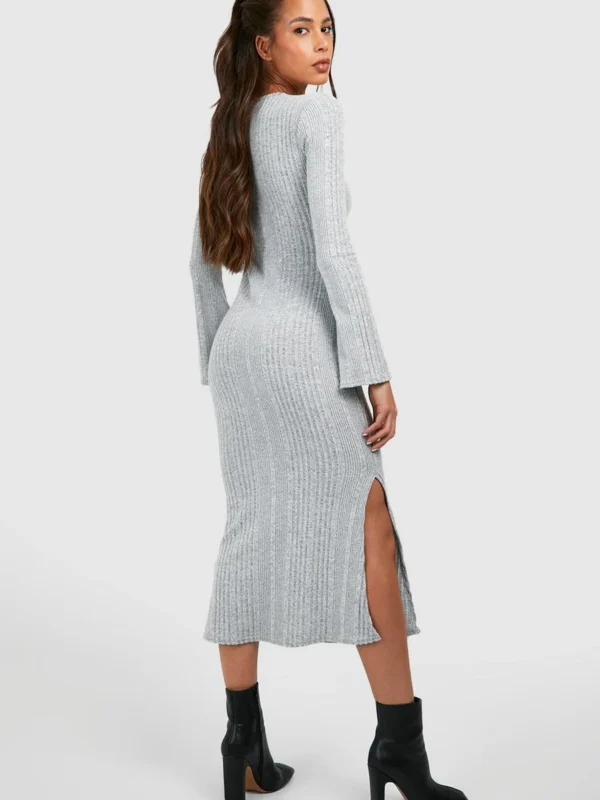 BOOHOO Textured Rib Flare Sleeve Split Leg Midi Dress