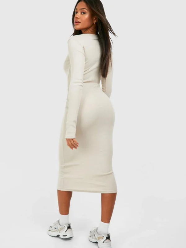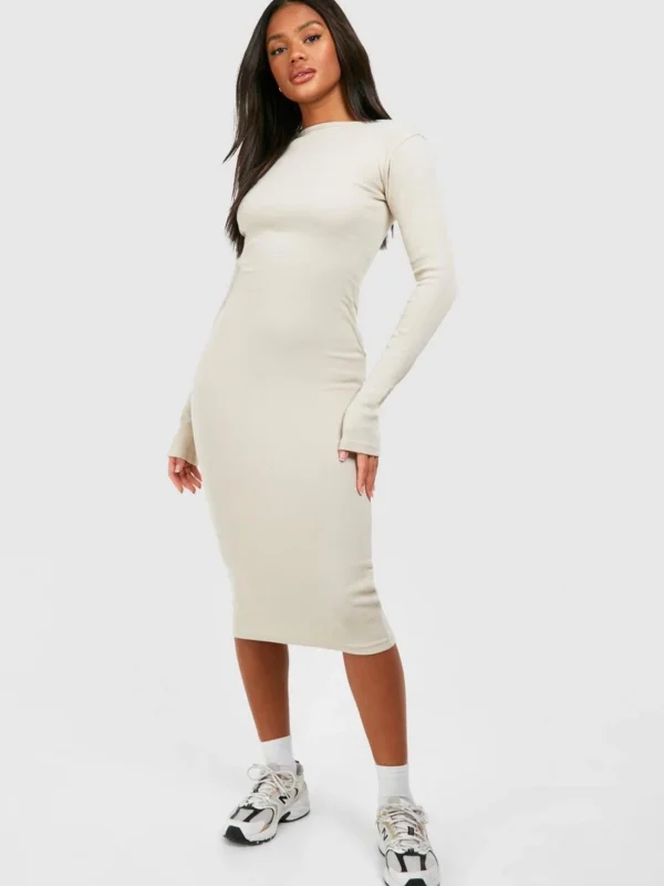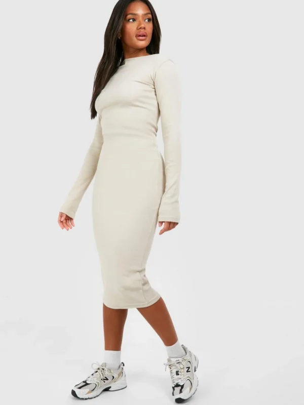 BOOHOO Slash Neck Long Sleeve Rib Midi Dress