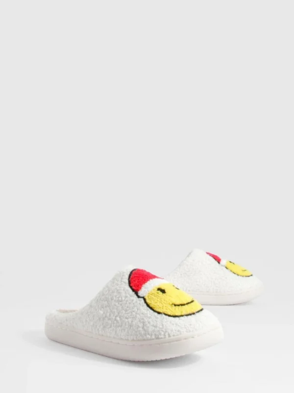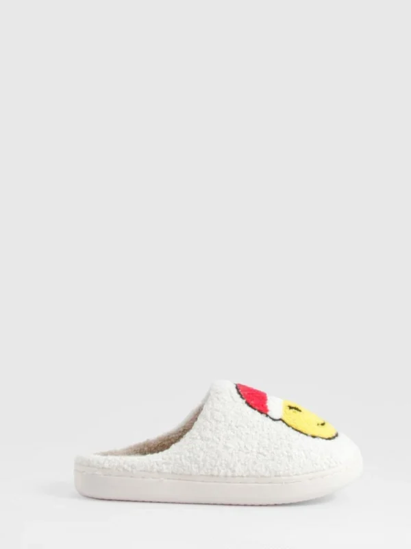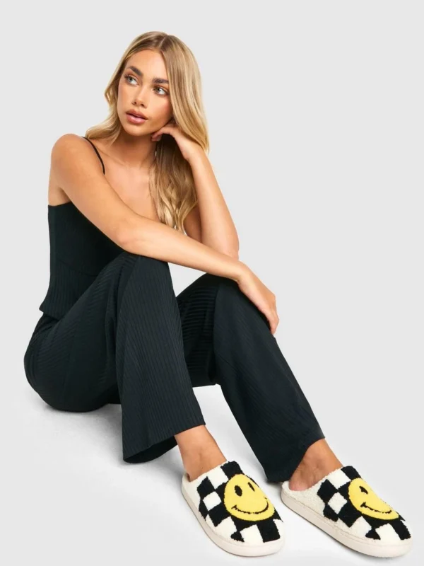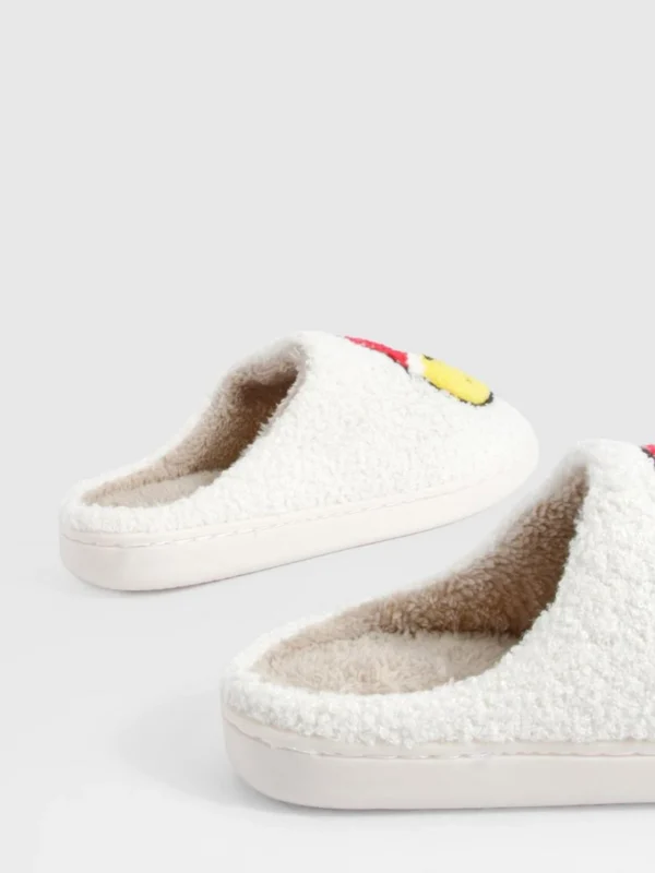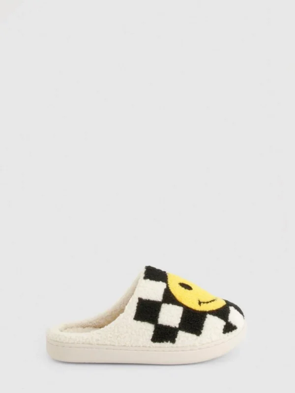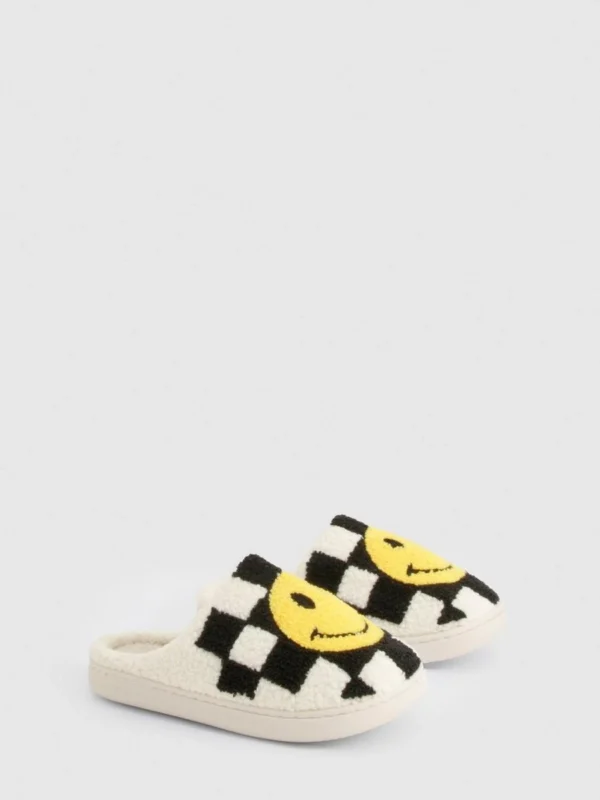 BOOHOO Borg Checkerboard Happy Face Slippers
