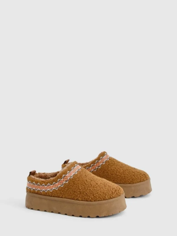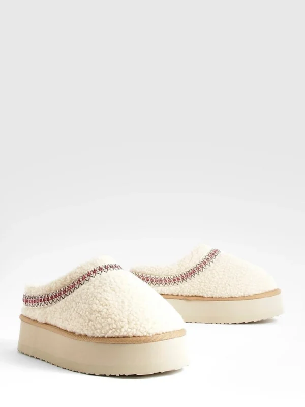 BOOHOO Borg Embroidered Detail Cosy Mules