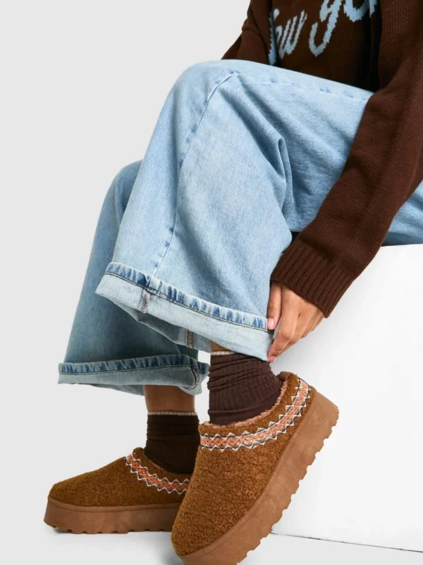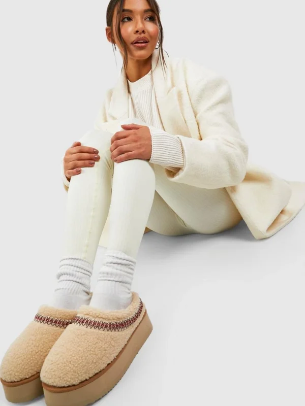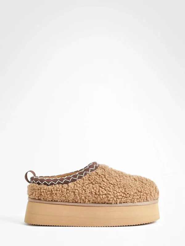BOOHOO Borg Embroidered Platform Cosy Mules