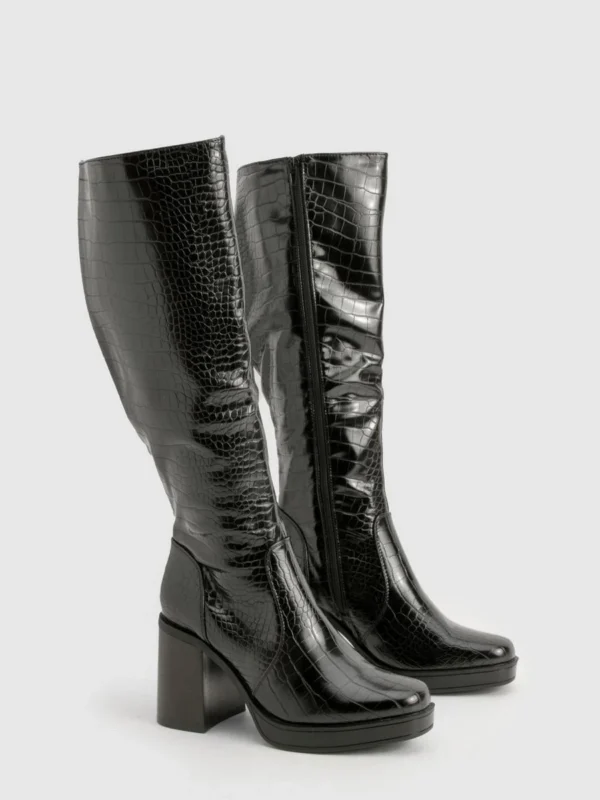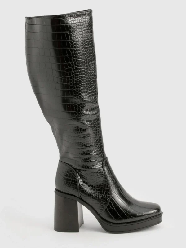 BOOHOO Platform Croc Block Heel Knee High Boots