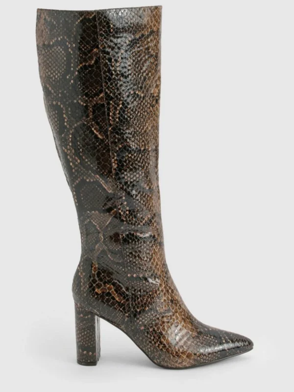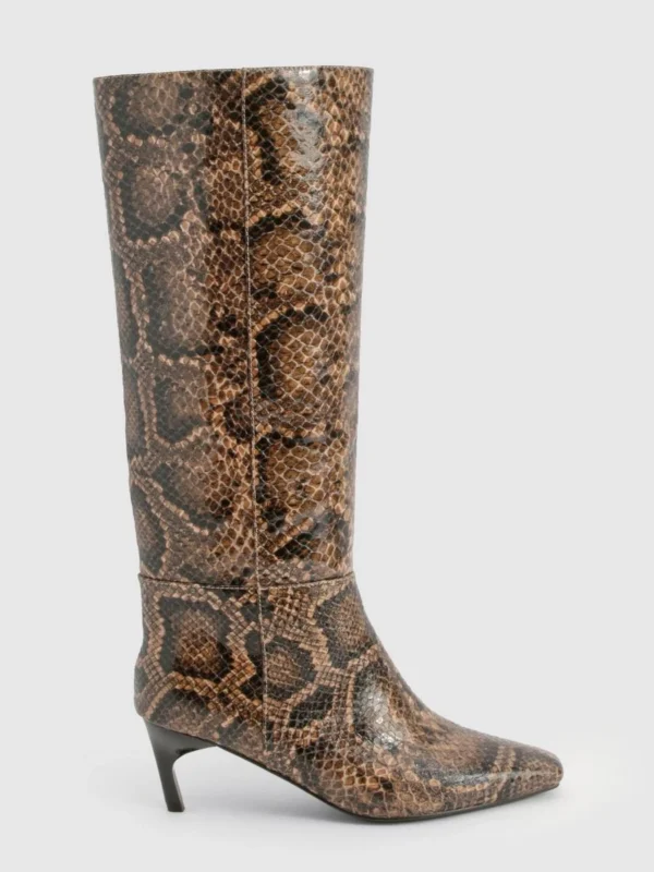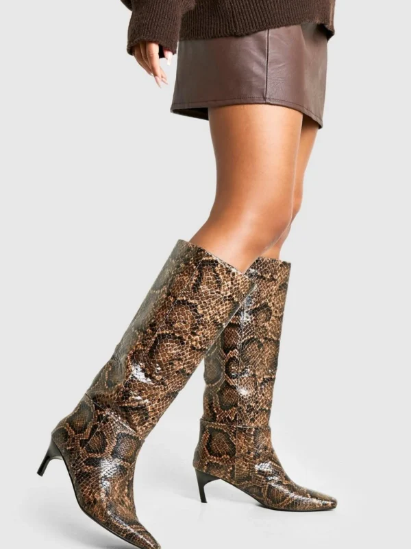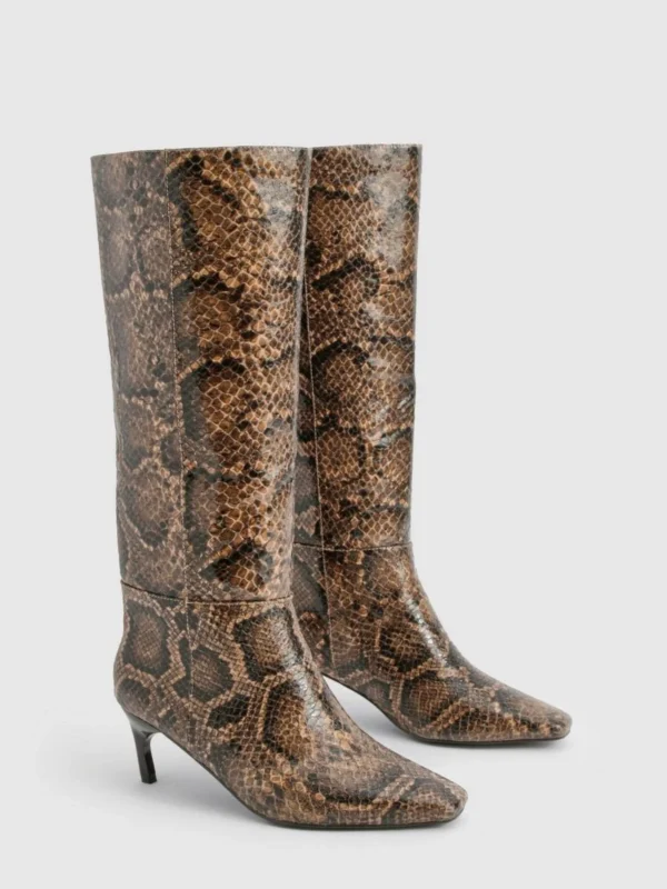 BOOHOO Snake Print Low Square Toe Knee High Boots
