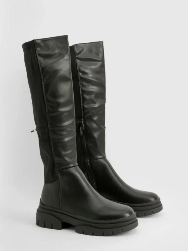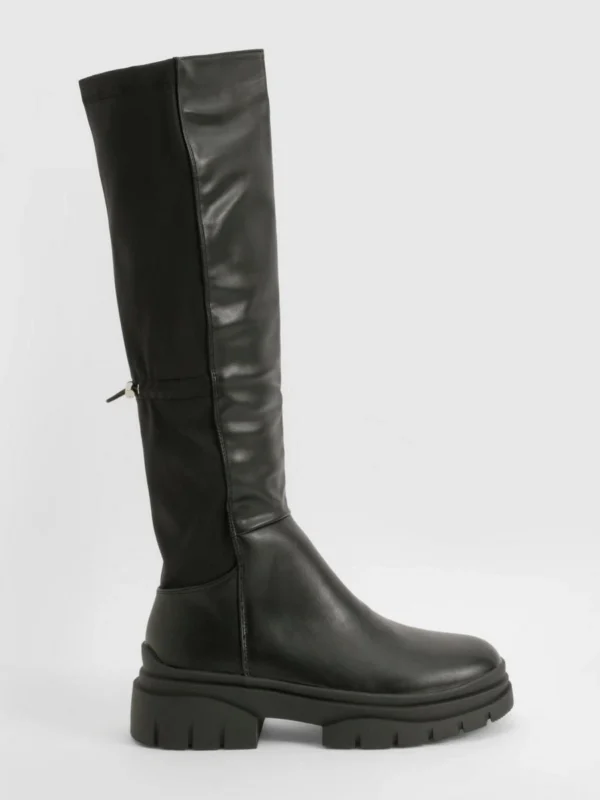 BOOHOO Stretch Panel Knee High Chunky Boots