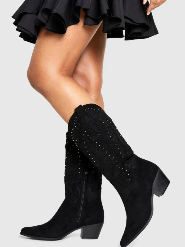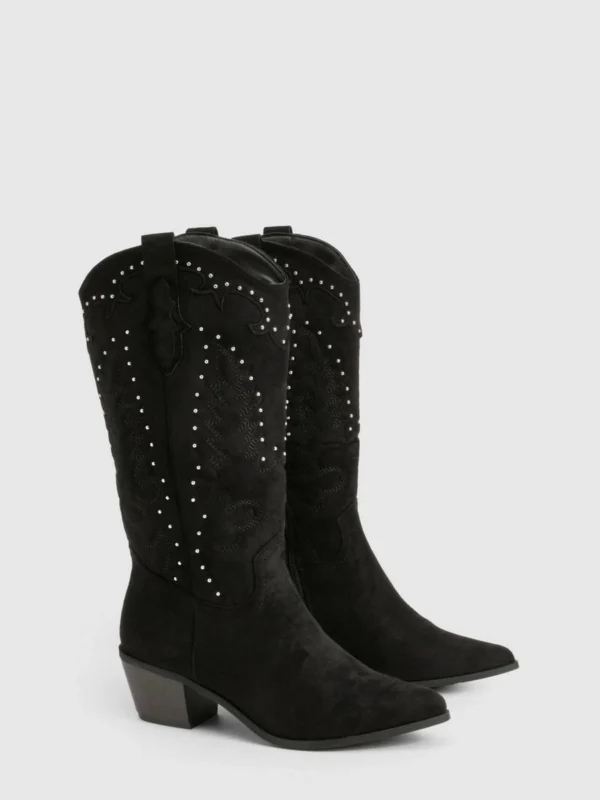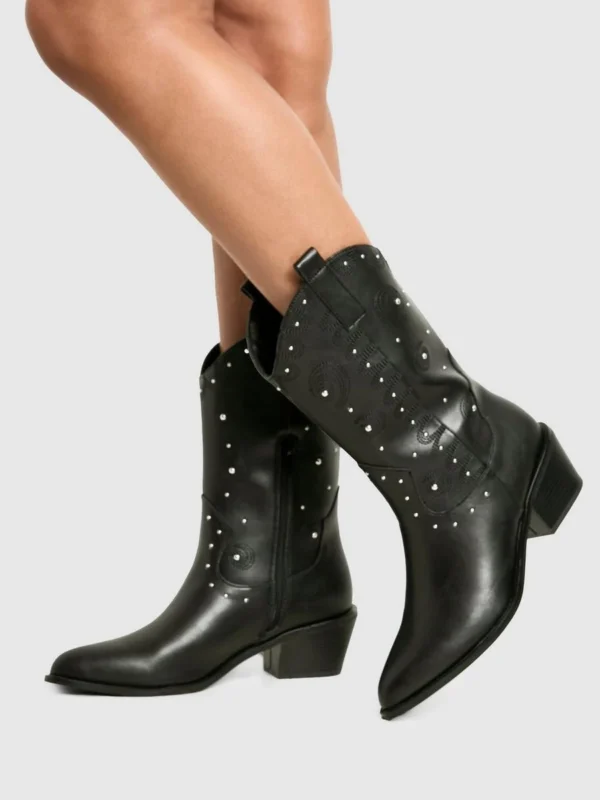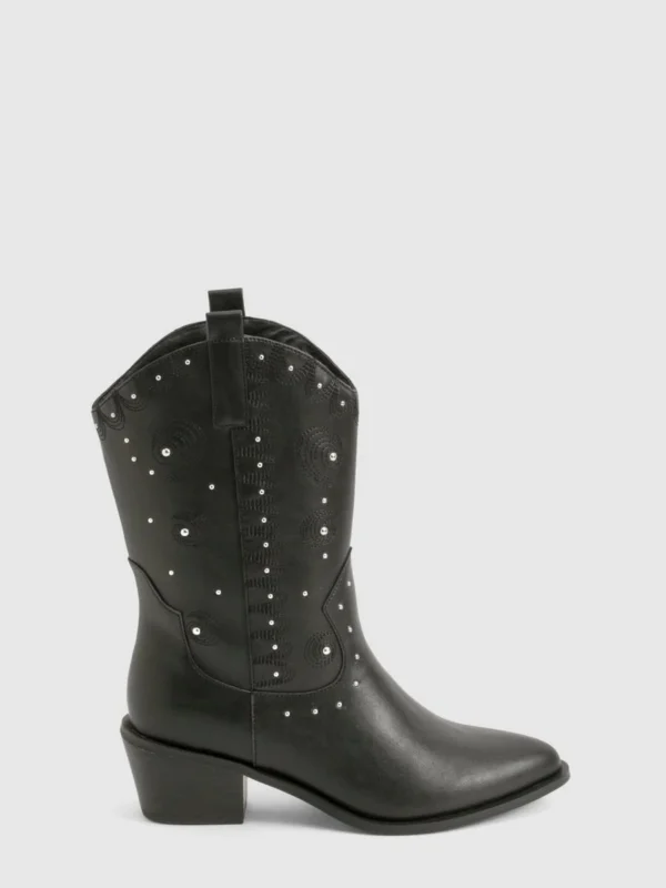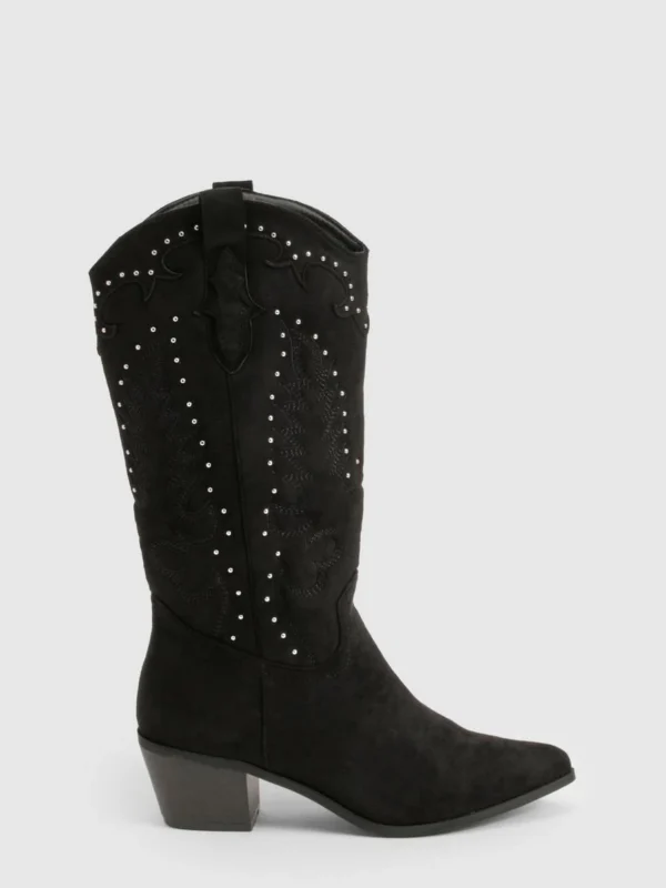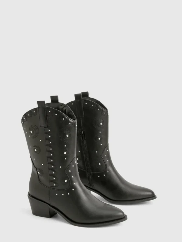 BOOHOO Studded Embossed Detail Heeled Western Boots