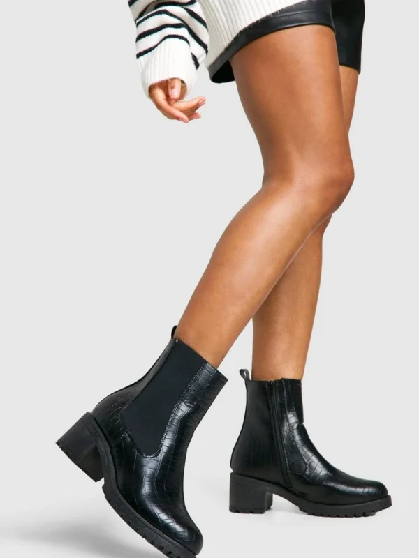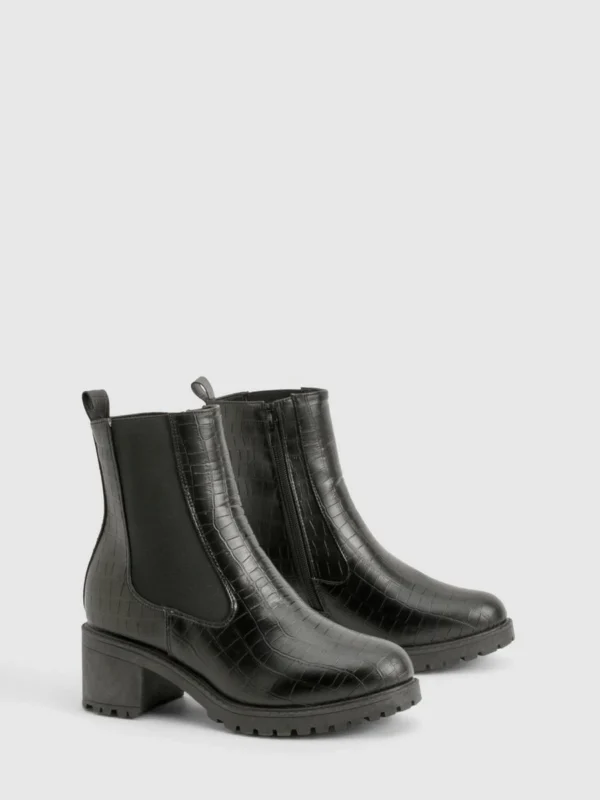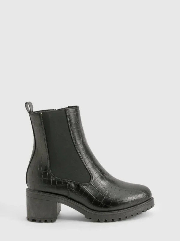 BOOHOO Tab Detail Low Block Heel Croc Chelsea Boots