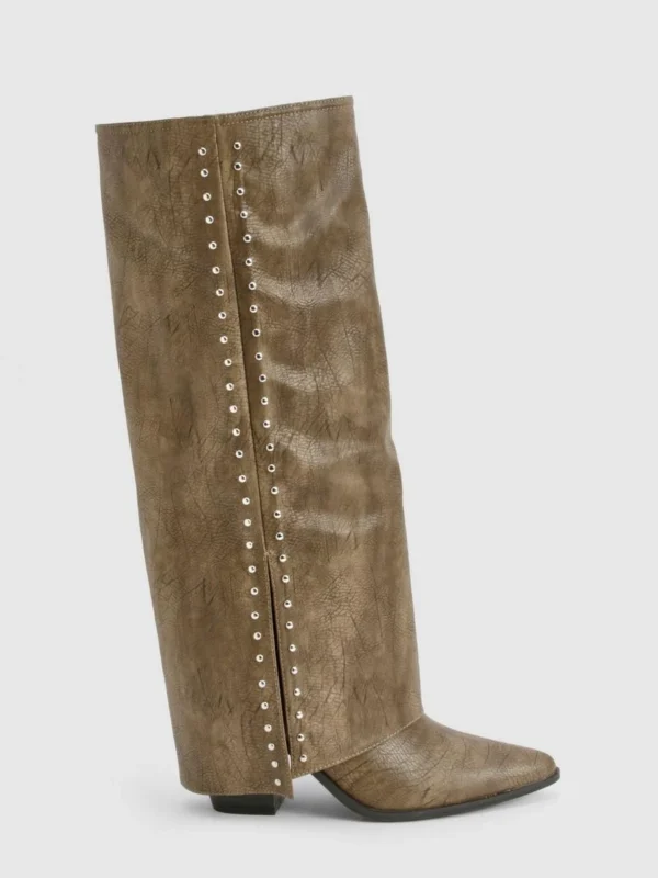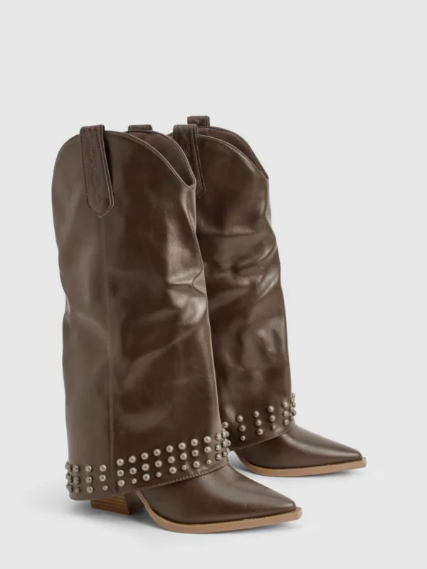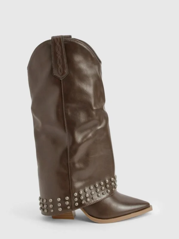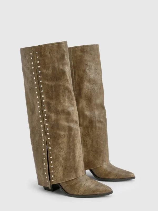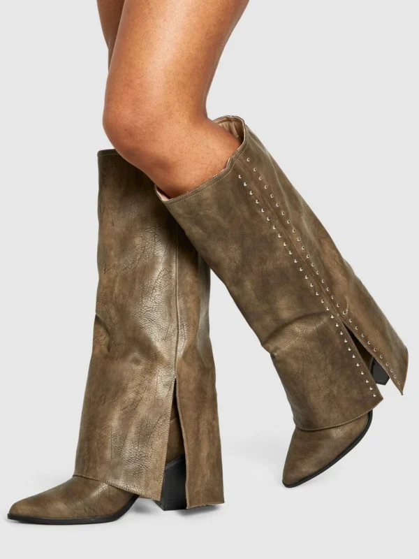 BOOHOO Studded Detail Fold Over Distressed Western Boot